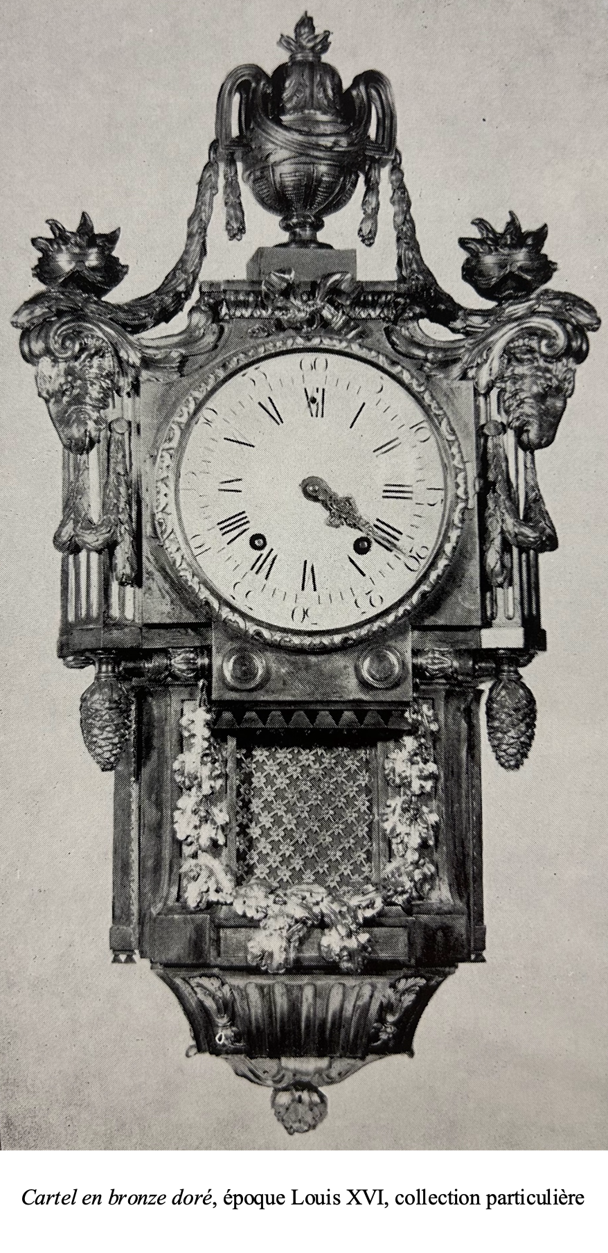 Dès le milieu du XVIIIe siècle nous assistons à une totale remise en cause des schémas ornementaux qui prévalaient dans les arts décoratifs français depuis plusieurs décennies. Cette réaction, menait par des érudits, des artistes et des amateurs, trouvait son origine dans les exceptionnelles découvertes archéologiques faites dans les anciennes cités romaines de Pompéi et d’Herculanum dans la région napolitaine. Au fil des années, quelques rares collectionneurs, artistes et artisans, vont imposer un nouveau style directement inspiré de l’Antiquité classique grecque et romaine : le Néoclassicisme. Le cartel que nous proposons fut réalisé dans ce contexte particulier ; il présente un dessin particulièrement architecturé, des proportions peu communes et un décor directement inspiré du répertoire antique. Le bronzier qui créa le modèle reste à ce jour inconnu, mais soulignons que la qualité exceptionnelle de la fonte, de la ciselure et de la dorure du modèle suggère la collaboration d’artisans de tout premier plan supervisés par un bronzier tels que Saint-Germain, Osmond ou Caffieri. Parmi les cartels similaires répertoriés, citons particulièrement un exemplaire, signé « Gide à Paris », qui est reproduit dans R. Mühe et Horand M. Vogel, Horloges anciennes, Manuel des horloges de table, des horloges murales et des pendules de parquet européennes, Office du Livre, Fribourg, 1978, p.190, fig.350. Enfin, relevons que quelques rares autres cartels de modèle identique sont connus : un premier a été proposé aux enchères au Palais Galliera à Paris, Me Ader, le 30 mars 1965, lot 75 (paru dans Tardy, La pendule française, 2èe Partie : Du Louis XVI à nos jours, Paris, 1975, p.310, fig.2) ; tandis qu’un second se trouvait anciennement dans la célèbre collection d’Alberto Bruni Tedeschi (1915-1996).