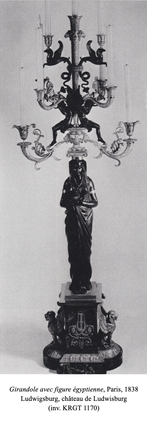 Pour contrecarrer les ambitions britanniques en Orient, la France mène, en 1798 et 1801, une expédition en Égypte afin de s’emparer du pays et de dominer politiquement et économiquement la région. Dirigée par le général Bonaparte, puis par ses successeurs, cette opération militaire, mieux connue sous le nom de « Campagne d’Égypte », se double d’une véritable mission de recherche composée d’éminents scientifiques, d’historiens et d’artistes de tout premier plan. De retour en France, les répercussions seront exceptionnelles, particulièrement dans le domaine des arts décoratifs. Dès 1802, le baron Vivant-Denon publie Voyage dans la Basse et la Haute Égypte, ouvrage qui rencontrera un immense succès. Puis ce sont les architectes, les peintres et les artisans qui se mettent à donner leur propre interprétation des modèles égyptiens qu’ils vont décliner et intégrer à leurs propres créations. Dans le domaine particulier du luminaire, de nombreux candélabres s’ornent de figures féminines hiératiques plus ou moins directement inspirées de la sculpture monumentale de l’Égypte des pharaons.