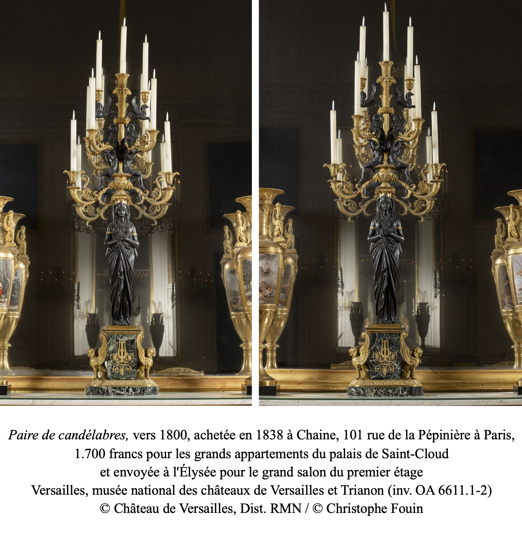 Les candélabres que nous proposons furent réalisés dans ce contexte particulier. Les figures qui jouent le rôle de supports s’inspirent des figures des temples égyptiens et sont caractéristiques d’une mode faisant immédiatement suite au Retour d’Égypte : « l’Égyptomanie ». Parmi les modèles de candélabres réalisés dans le même esprit, nous pouvons citer notamment une paire conservée dans les collections du Musée Ostankino (illustrée dans I. Efremova et I. Petuhova, Lighting devices, Collection of the Museum estate Ostankino, Moscou, 2005, p.342, fig.283) ; et particulièrement un modèle de candélabres attribuable au bronzier Thomire ornée de figures égyptiennes et de bouquets à personnages adossés dont une paire est exposée au Grand Trianon, dans les jardins du château de Versailles (voir P. Arizzoli-Clémentel et J-P. Samoyault, Le mobilier de Versailles, Chefs-d’œuvre du XIXe siècle, Editions Faton, Dijon, 2009, p.266, catalogue n°94)