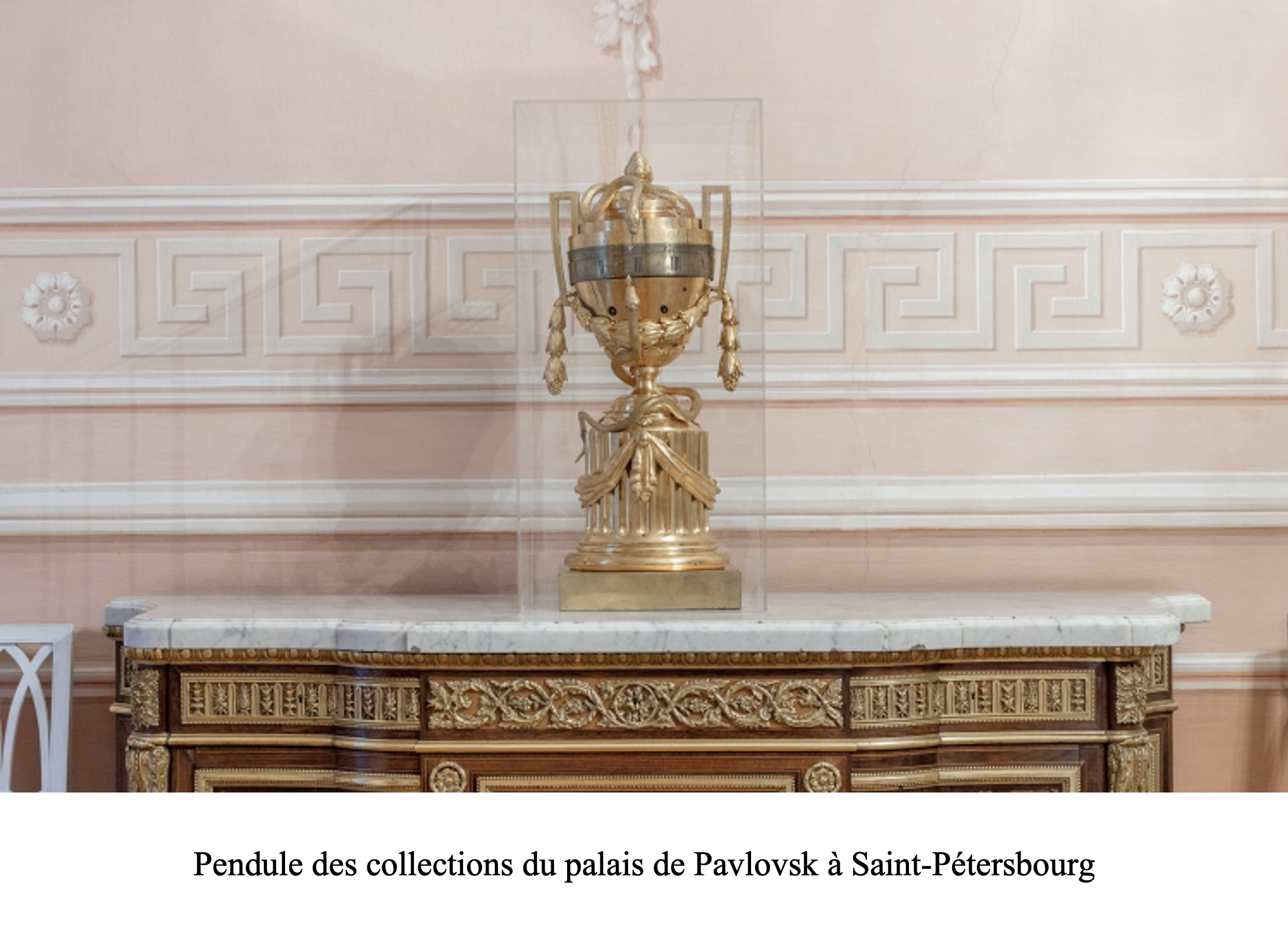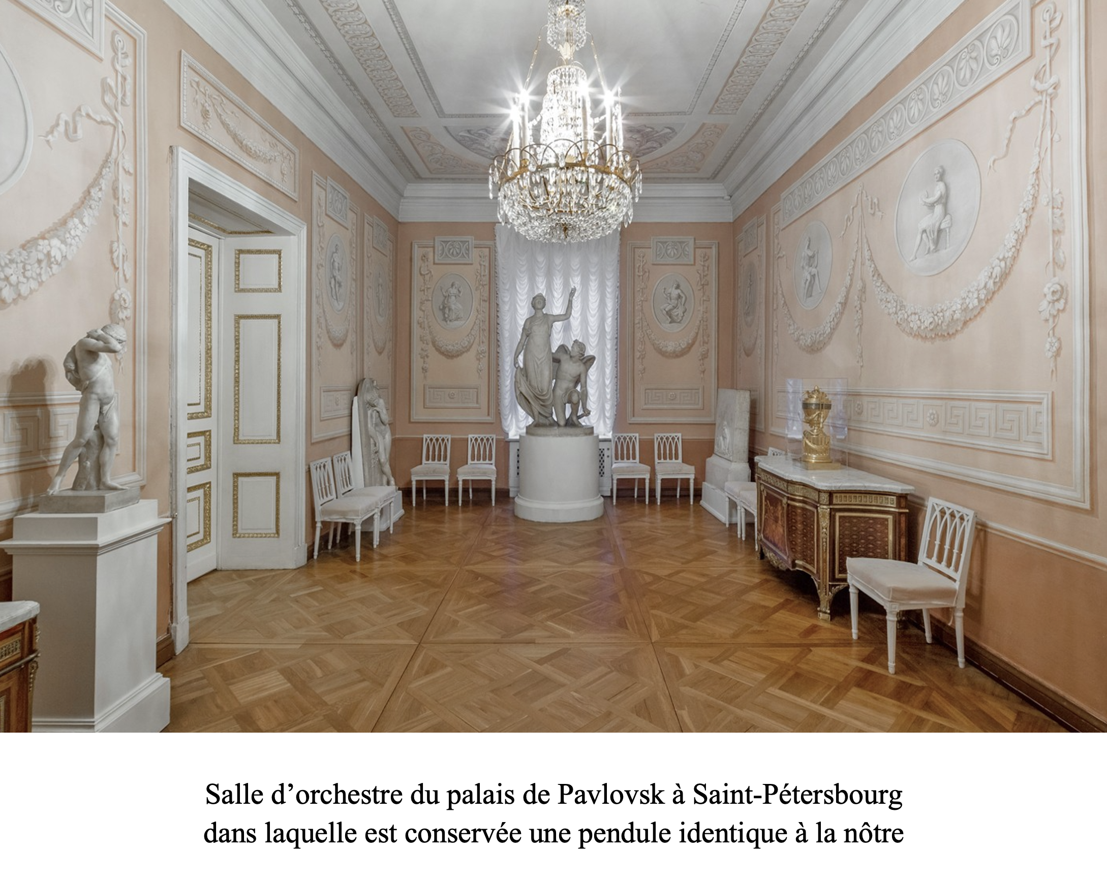 De nos jours, et à notre connaissance, seules quatre autres pendules identiques sont répertoriées : la première, signée de « Lepaute », figura au XIXe siècle dans la vente des célèbres et fastueuses collections de William 12th duc de Hamilton à Hamilton Palace (vente Christie, Manson & Woods, du 17 juin au 20 juillet 1882) et semble correspondre à celle décrite dans une grande collection dans la seconde moitié du XVIIIe siècle : « Une pendule à vase, à anses carrées, guirlandes de laurier sur colonnes cannelées, tronquées avec draperies, le tout en bronze doré d’or moulu. Cadran tournant. Deux serpents portant les aiguilles des minutes. Le mouvement est de Lepaute » ; la deuxième, le bronze gravé du nom de l’horloger « Furet », est illustrée dans P. Kjellberg, Encyclopédie de la pendule française du Moyen Age au XXe siècle, Les éditions de l’Amateur, Paris, 1997, p.284, fig. B ; la troisième, qui a la particularité d’associer bronze doré et marbre blanc et propose quelques variantes dans le décor, appartient aux collections du Musée du Louvre à Paris (reproduite dans Tardy, La pendule française, 2ème Partie : Du Louis XVI à nos jours, Paris, 1975, p.289, fig.5 ; et dans E. Niehüser, Die französische Bronzeuhr, Eine Typologie der figürlichen Darstellungen, Editions Callwey, Munich, 1997, p.263, fig.1292) ; enfin, mentionnons tout particulièrement une quatrième et dernière pendule de ce type, en tous points identique à celle que nous proposons, qui figure dans les collections d’horlogerie du Palais de Pavlovsk, près de Saint-Pétersbourg, ancienne résidence d’été du Tsar Paul Ier ; elle porte également la signature de l’horloger Antoine Cronier gravée dans le bronze et est rapprochée de l’œuvre du bronzier Osmond (parue dans The State Culture Preserve Pavlovsk, Full Catalogue of the Collections, Tome X, Métal-Bronze, Volume I, Pendules, régulateurs, cartels, Saint-Pétersbourg, 2011, p.24, catalogue n°7).
