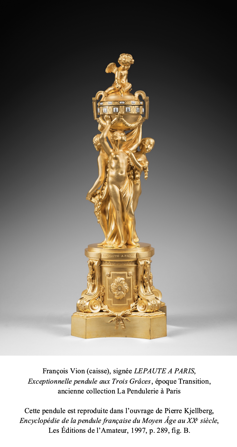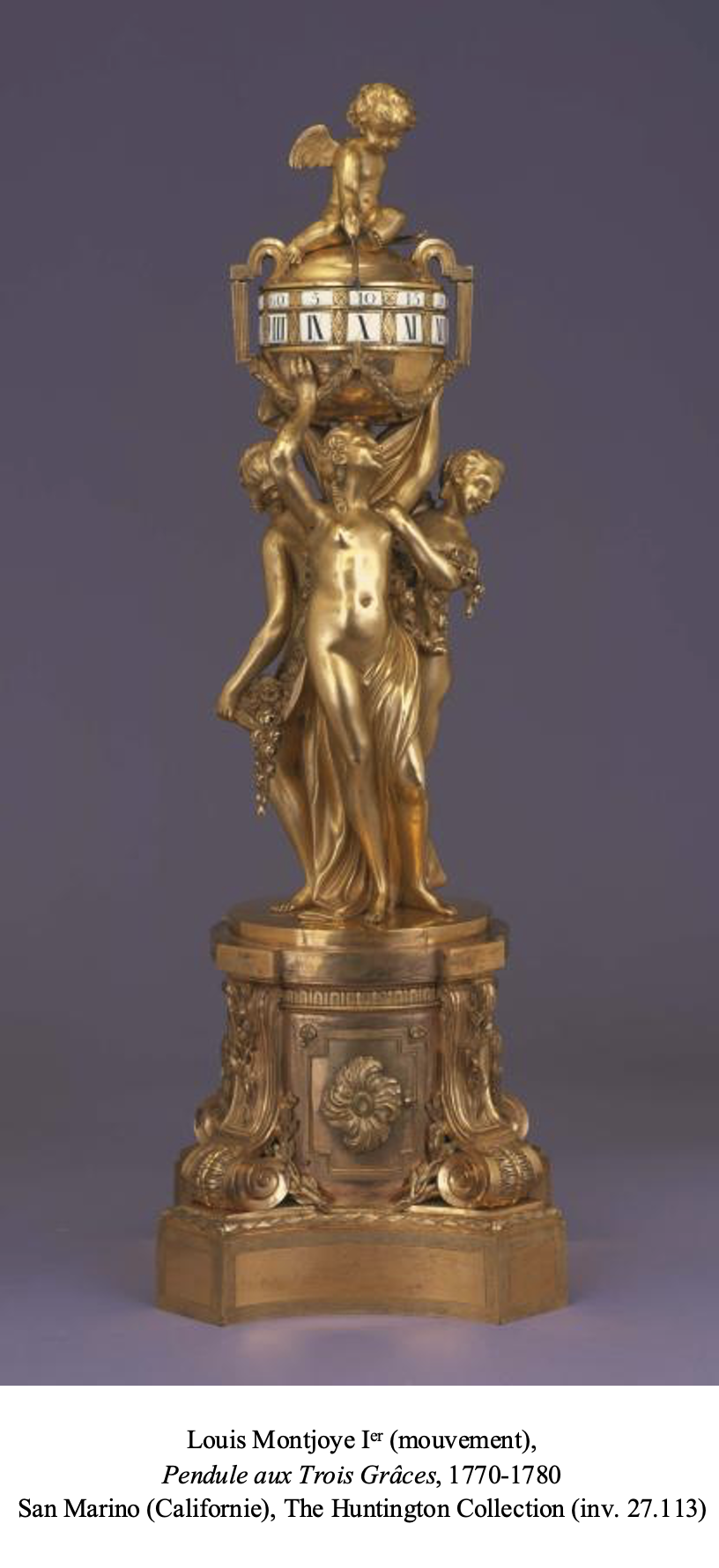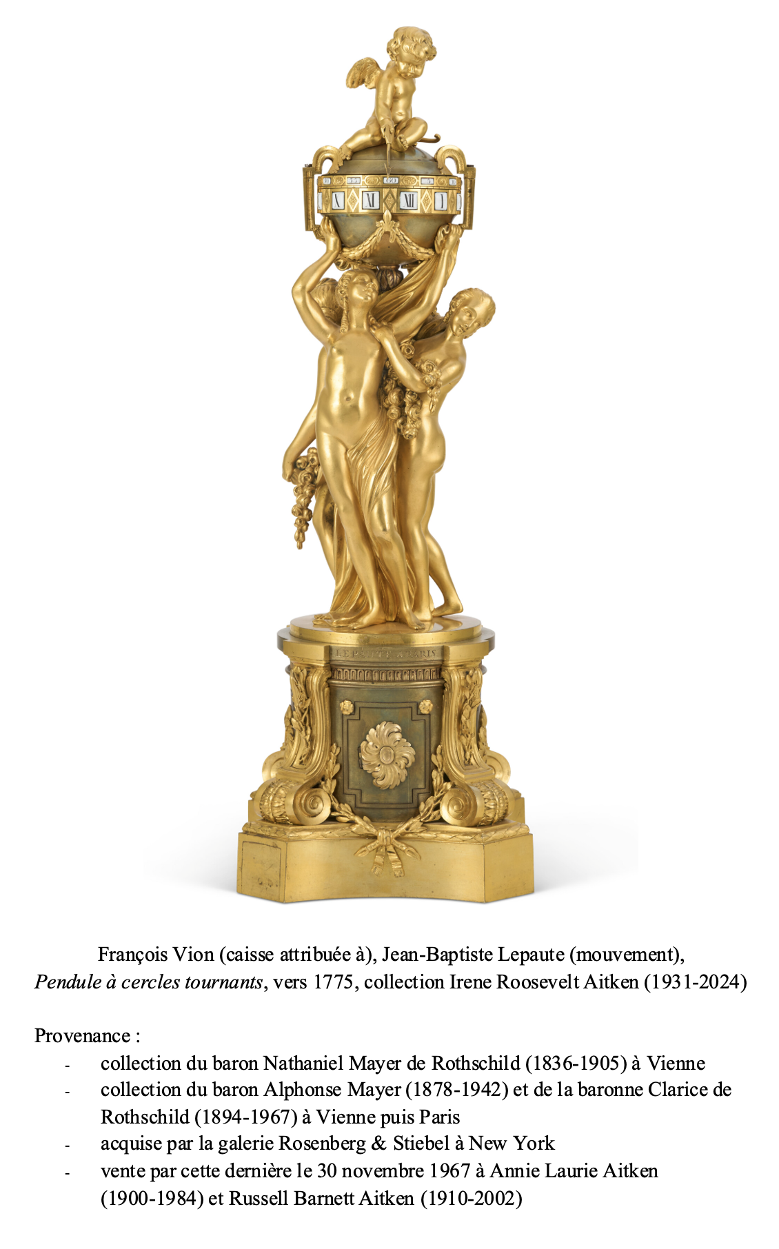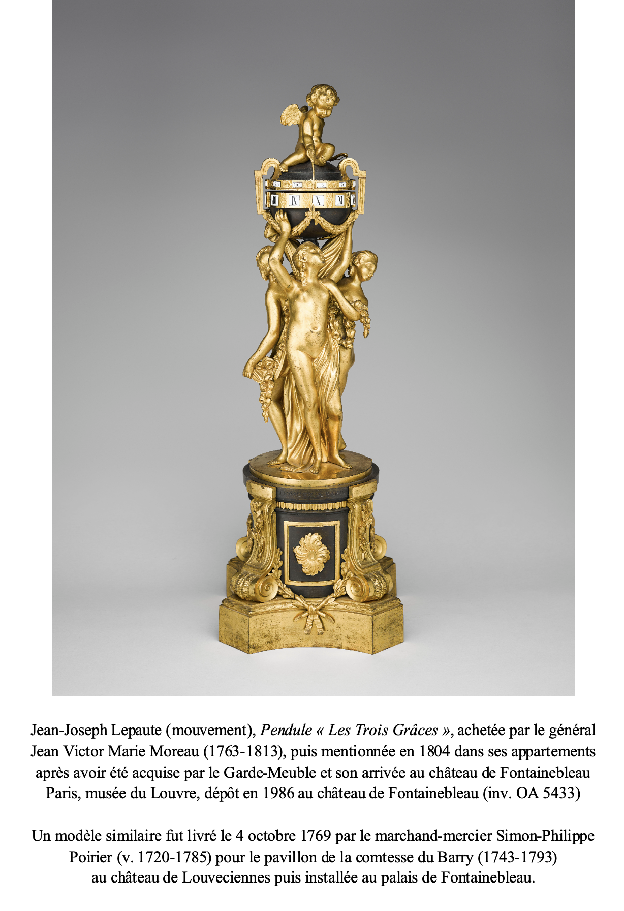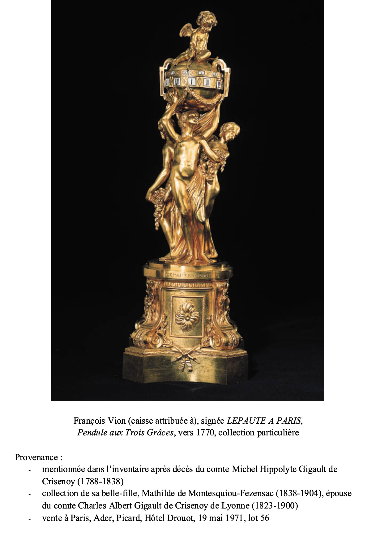 Moins d’une vingtaine d’années plus tard, en avril 1787, un second exemplaire fut décrit dans la vente après décès de Nicolas Beaujon, ancien banquier de la Cour et Conseiller d’état : « 415 : Une pendule, mouvement de Lepaute à Paris, présentant un globe en bronze en couleur antique, indiquant les heures marquées par un amour tenant une flèche, et porté par les trois grâces, le tout sur piédestal à consoles en volutes et avant-corps à rosace en bronze doré. Hauteur 19 pouces ».