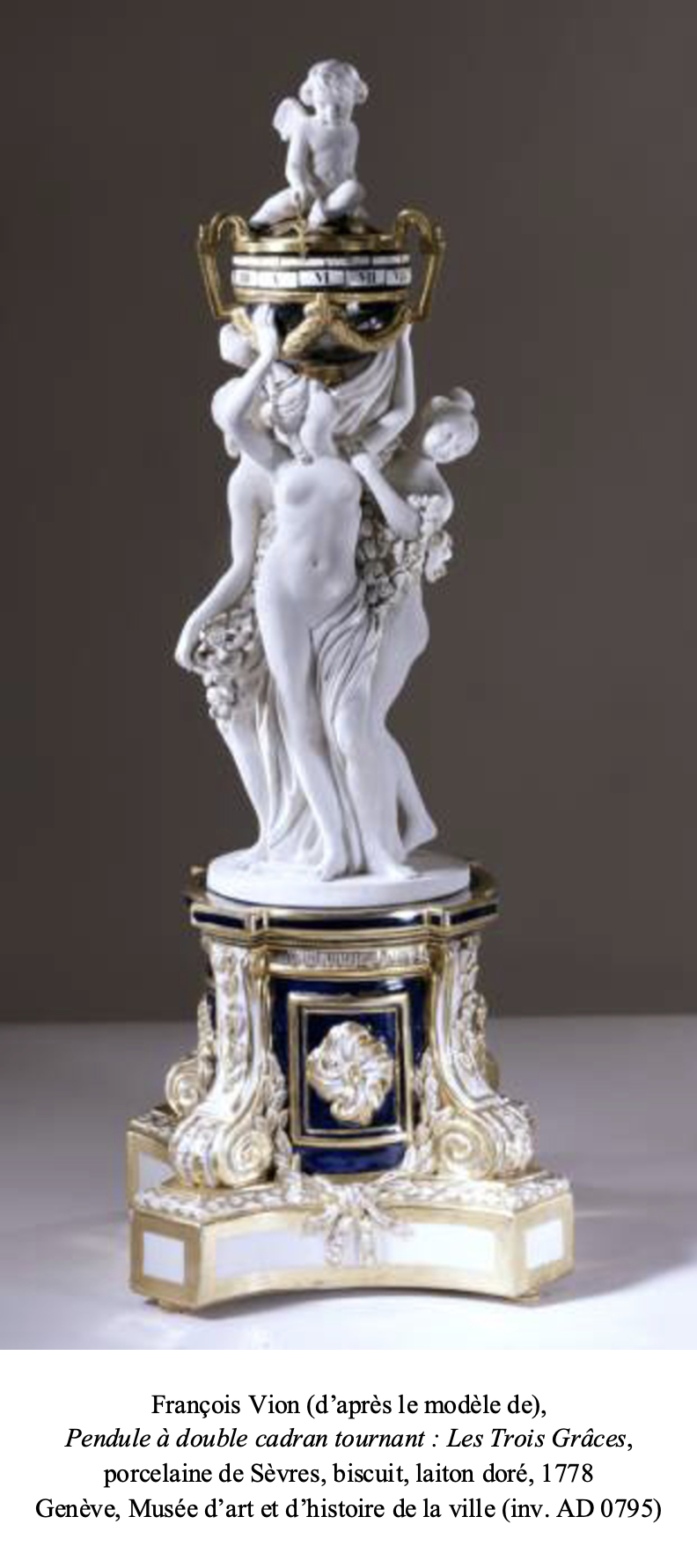 ; enfin, mentionnons un dernier modèle qui a la particularité d’être réalisé en porcelaine polychrome de la Manufacture royale de Sèvres et est conservé au Musée d’Art et d’Histoire de Genève (voir Tardy, La pendule française, 2ème Partie : Du Louis XVI à nos jours, Paris, 1975, p.291, fig.1).