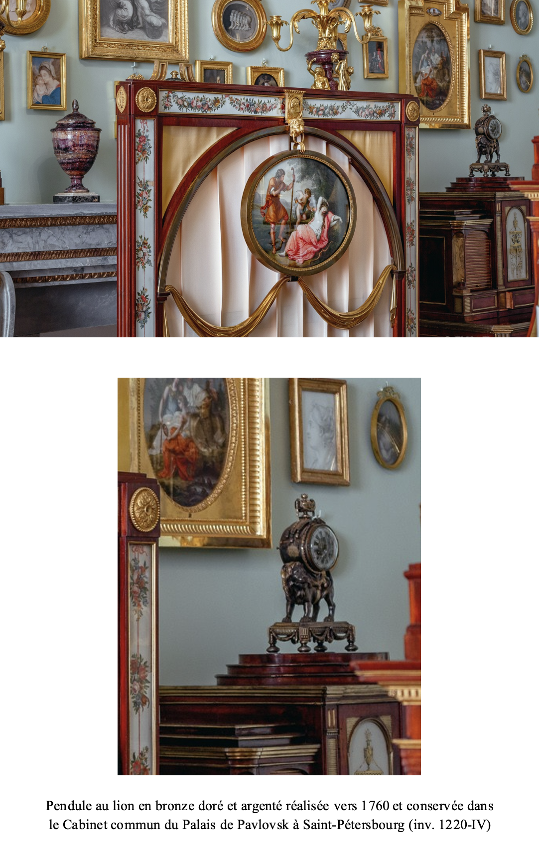 ; enfin, à la fin du XIXe siècle une « Petite pendule du temps de Louis XVI, en bronze doré et bronze vert, à mouvement visible à travers un cadran de verre, du nom de Lepaute, à Paris. Ce cadran, dont les aiguilles et l’entourage sont enrichis de marcassites, est placé dans un tambour surmonté d’une cassolette et supporté par un lion de bronze vert marchant vers la gauche. Ce lion est élevé sur un socle rectangulaire de bronze doré à angles en ressaut ornés de triglyphes ; le pourtour de ce socle est décoré de grecques et de guirlandes de laurier en bronze vert. Hauteur 31cm ; largeur 18cm » est décrite dans la collection du comte d’Armaillé.