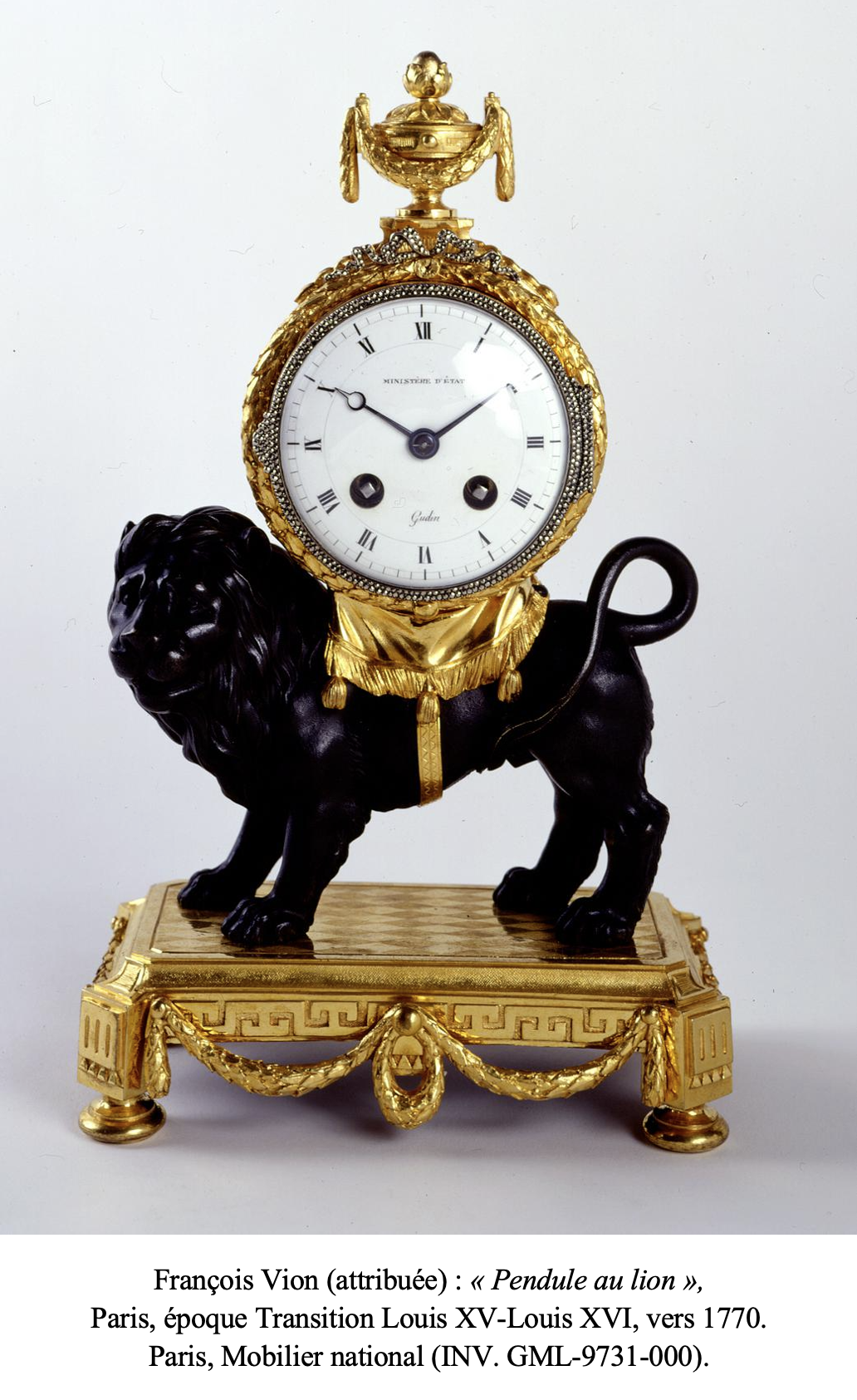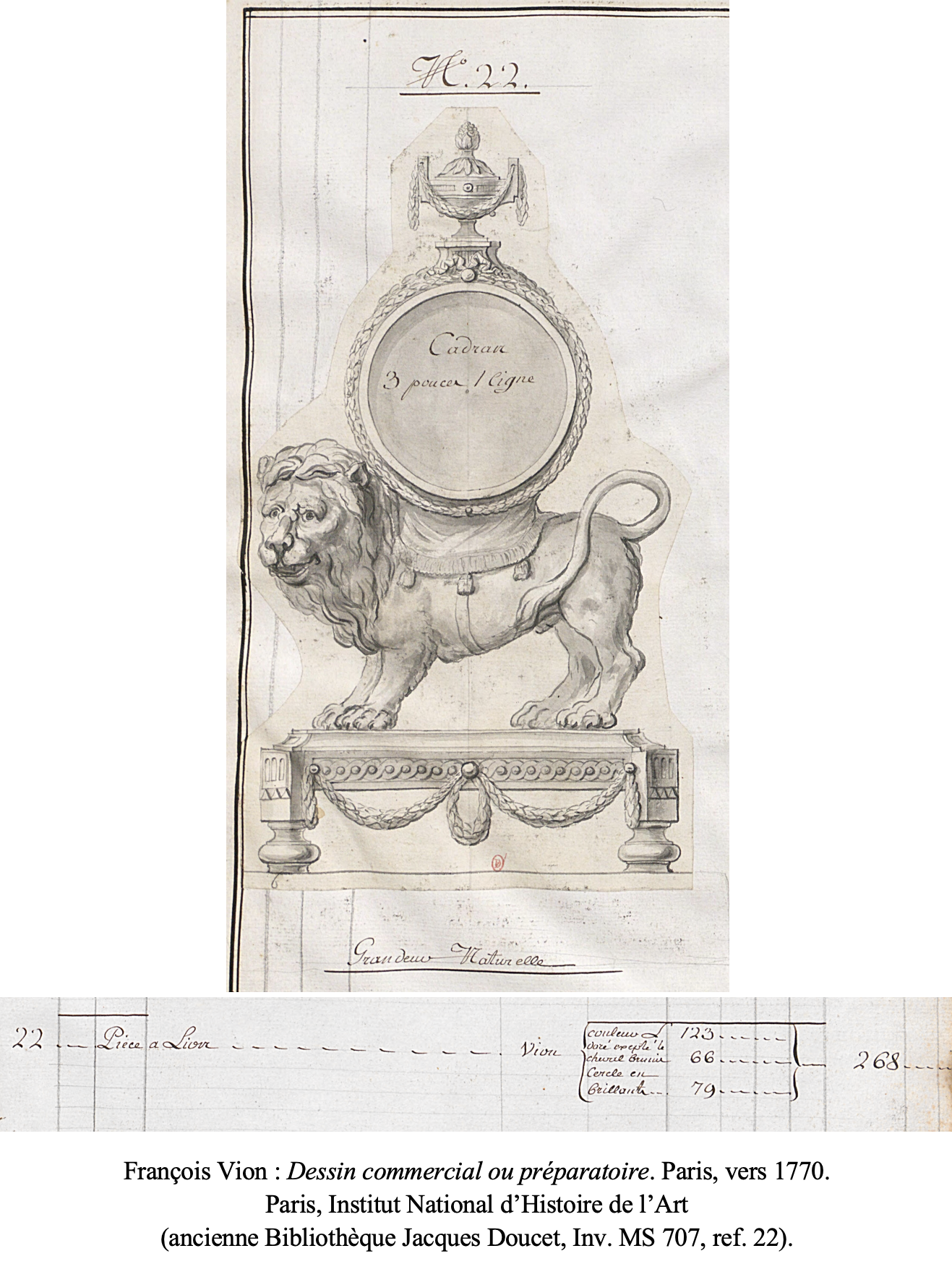 Apparues véritablement sous le règne de Louis XV, les horloges à figures d’animaux supportant les mouvements connaîtront un exceptionnel engouement dans la seconde moitié du XVIIIe siècle au moment du Néoclassicisme marquant le renouveau des arts décoratifs français, plus particulièrement parisiens. La pendule que nous proposons se distingue notamment par l’originalité de sa composition et la qualité de sa ciselure et de sa dorure, et particulièrement par la connaissance du dessin commercial ou préparatoire à l’origine de sa réalisation qui est conservé à l’Institut national d’Histoire de l’Art à Paris, dessin numéro 22 faisant partie d’un album du bronzier François Vion permettant ainsi d’attribuer en toute certitude le modèle à ce bronzier parisien (voir H. Ottomeyer et P. Pröschel, Vergoldete Bronzen, Die Bronzearbeiten des Spätbarock und Klassizismus, Munich, 1986, Band I, p.193, fig.3.11.6).