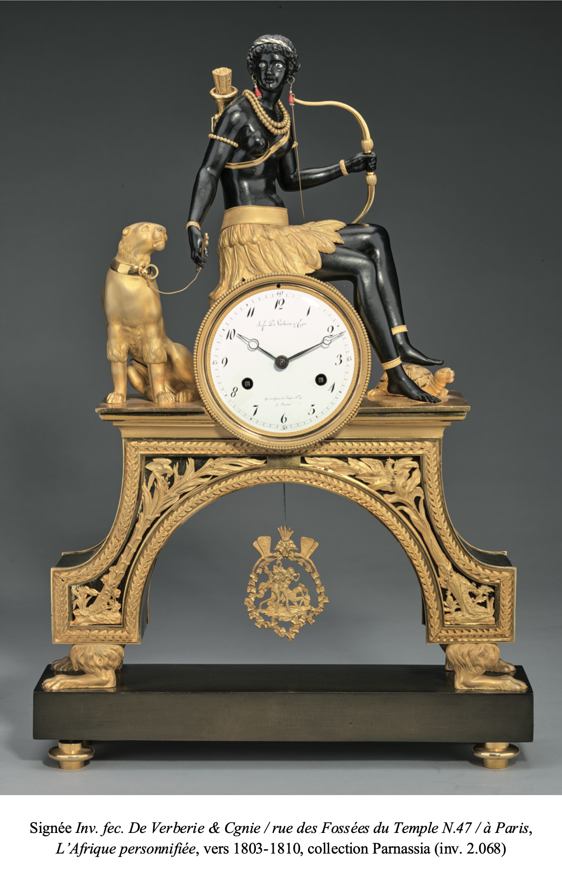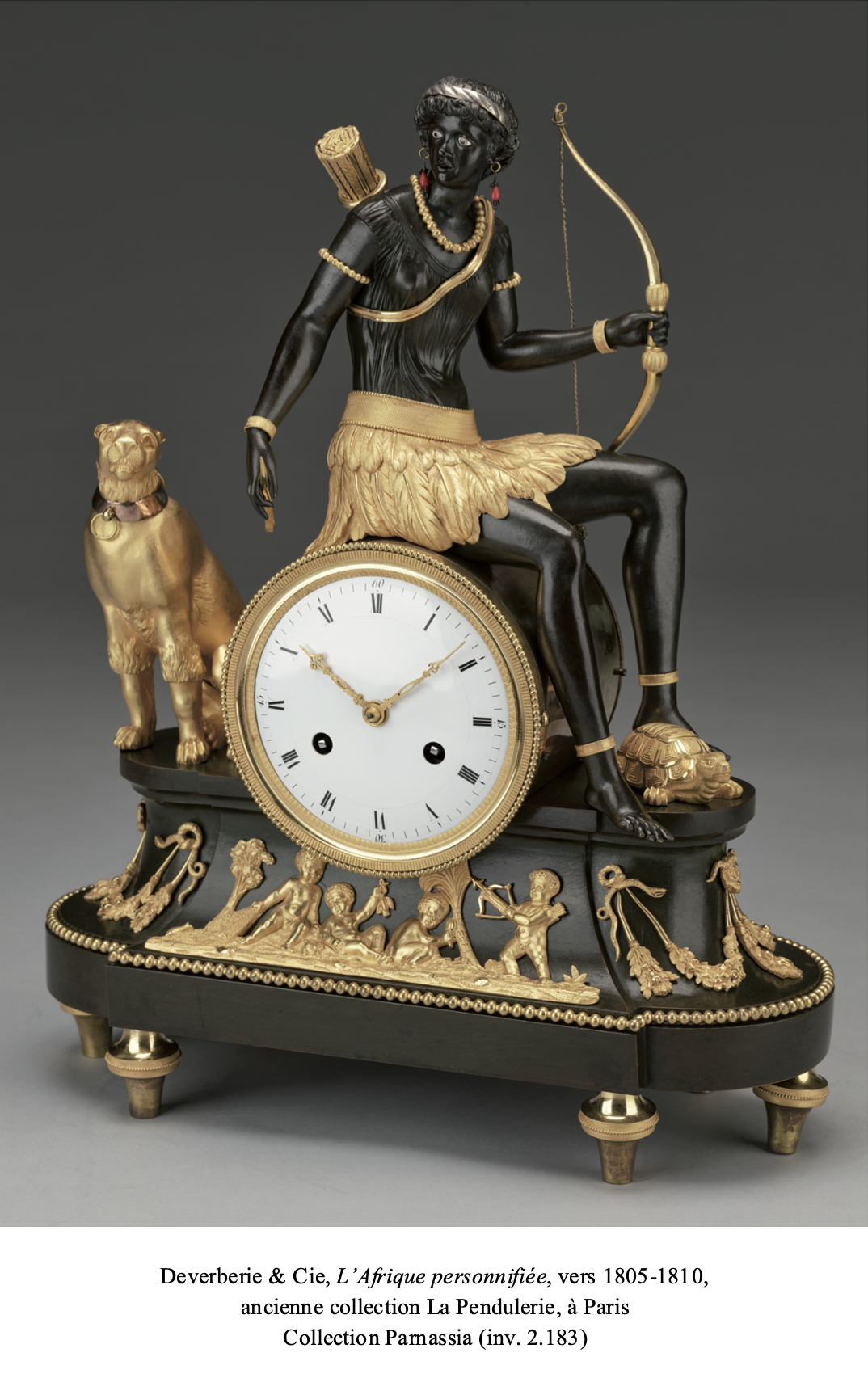 Avant la fin du XVIIIe siècle, le noir constitue rarement un thème décoratif pour les créations horlogères françaises et plus largement européennes. C’est véritablement à la fin de l’Ancien Régime, plus précisément dans la dernière décennie du XVIIIe siècle et dans les premières années du siècle suivant, qu’apparaissent les premiers modèles de pendules dites « au nègre » ou « au sauvage ».