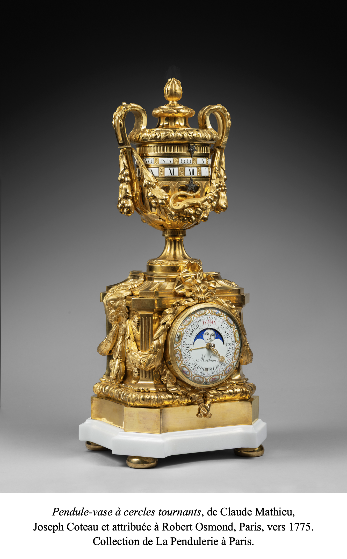 Réalisée dans le plus pur esprit néoclassique du règne de Louis XVI, la pendule que nous proposons se distingue par l’originalité de sa composition et par la qualité exceptionnelle de sa ciselure et de sa dorure qui nous permettent de la rattacher à l’œuvre de Robert Osmond, l’un des meilleurs bronziers parisiens de l’époque. Il est particulièrement intéressant de relever que cette pendule est de modèle excessivement rare et qu’elle décline un type d’horloges-vase dites « à la salamandre » très probablement commercialisé par l’horloger Mathieu qui en avait confié la fonte à Robert Osmond.