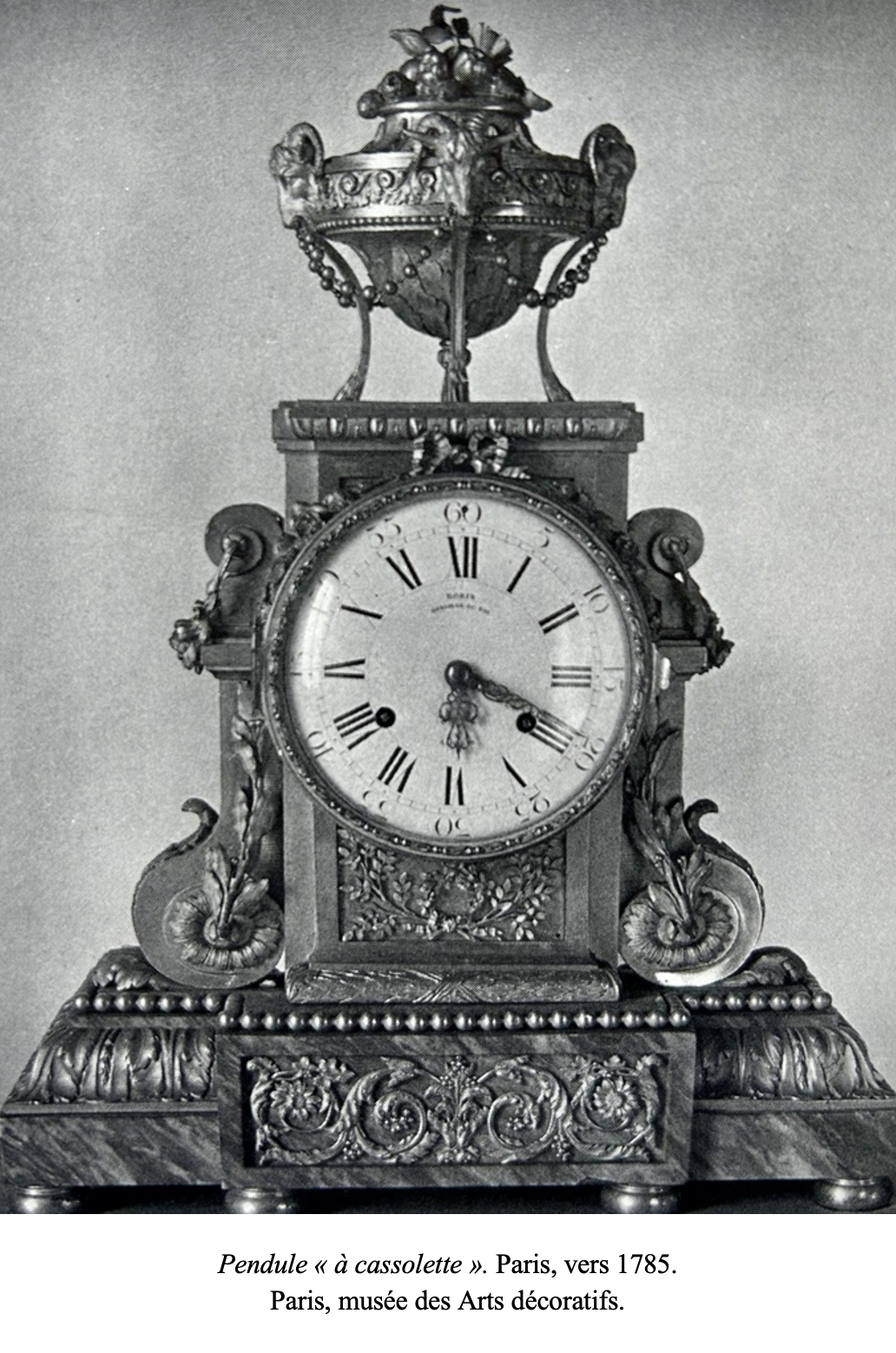 De nos jours, parmi les rares modèles similaires connus, citons particulièrement : un premier exemplaire, le cadran signé « Montjoye », qui appartient aux collections royales suédoises (illustré dans J. Böttiger, Konstsamlingarna A De Svenska Kungliga Slotten, Stockholm, 1900) ; ainsi qu’un deuxième, le cadran signé « Robin », qui est exposé au Musée des Arts décoratifs à Paris (paru dans H. Ottomeyer et P. Pröschel, Vergoldete Bronzen, Die Bronzearbeiten des Spätbarock und Klassizismus, Munich, 1986, Band I, p. 226, fig. 4.1.2) ; une troisième pendule de ce type, signée par ce même horloger, est conservée dans les collections royales anglaises (inv. RCIN 2825) ; une quatrième, le recouvrement orné d’un groupe de putti, est reproduite dans Ruth T. Constantino, How to know French Antiques, New York, 1961, p. 155 ; une cinquième fait partie des collections du Mobilier national à Paris (inv. GML-6762) ; enfin, mentionnons une dernière horloge de ce type, à cadran émaillé à complications, qui fut saisie à la Révolution chez le marquis de Sérent et se trouva par la suite dans la collection de la Galerie Didier Aaron (voir J-D. Augarde, Les ouvriers du Temps, Le pendule à Paris de Louis XIV à Napoléon Ier, Genève, 1996, p. 262, fig. 205).