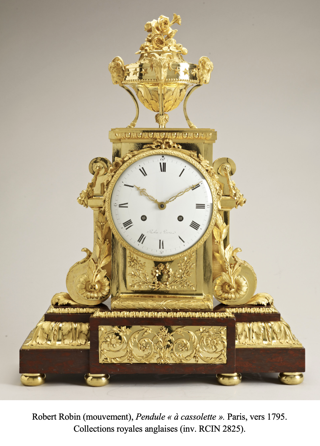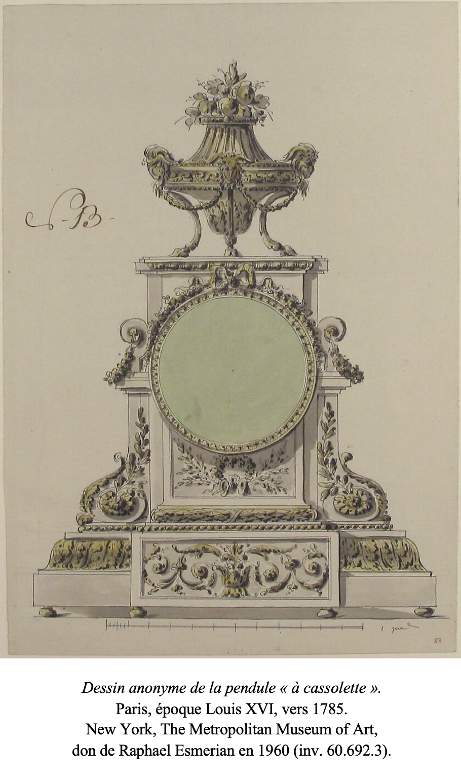 La composition originale de cette importante pendule de cheminée s’inspire directement d’un dessin anonyme, préparatoire ou commercial, provenant des collections du duc de Teschen et qui appartient aux collections du Metropolitan Museum of Art à New York (Inv.60.692.3, don de Raphael Esmerian) ; Jean-Dominique Augarde attribue la création du modèle au fondeur parisien méconnu Jean-Jacques Lemoyne, information recoupée par Christian Baulez, convervateur honoraire du Château de Versailles, qui apporte le rectificatif du patronyme Lemoigne et non Lemoyne. Le modèle rencontra un immense succès auprès des grands amateurs parisiens du dernier tiers du XVIIIe siècle, particulièrement auprès des membres de la famille royale et de son cercle proche, ainsi le roi Louis XVI, la reine Marie-Antoinette, Madame Victoire et le comte de Provence, possédèrent des pendules de ce modèle, avec certaines variantes ; l’exemplaire qui appartint au comte de Provence, le cadran signé « Robin », est de dimensions plus réduites et son amortissement est agrémenté d’un groupe de colombes se becquetant ; il fit son apparition sur le marché de l’art international en 1998 (vente French & Company, Christie’s, New York, 24 novembre 1998, lot 14). Tandis qu’un autre exemplaire figurait à la Révolution au Palais du Luxembourg : « Une pendule de cheminée de Robin en bronze doré sur un socle de marbre blanc, le corps de la pendule de forme carrée avec consoles sur les côtés, surmontée d’un vase en cassolette à têtes de bélier terminé d’un bouquet de fleurs portant 24 pouces de haut sur 19 de large le tout richement doré et ciselé (Archives nationales O/2/470, Luxembourg, Effets propres à l’exportation et aux échanges avec l’étranger, provenant du mobilier de Monsieur) ; description reprise avec plus de détails peu de temps après : « Une autre pendule de cheminée (par Robin) en bronze doré sur un socle de marbre blanc portée par six piédouches en cuivre doré et ornée à la frise d’une tête de lion tenant deux palmiers enlacés de branches de feuilles, la moulure du socle à large feuille et entrelacs et un rang de perles sur le dessus. Le corps de ladite pendule de forme carrée avec consoles sur les côtés ornée de feuilles, rosaces et volutes à guirlandes, surmonté d’un vase en cassolette à têtes de bélier, guirlandes en chaînes terminé d’un bouquet de fleurs, le tout richement ciselé à ornements en bronze doré or mat : de 24 pouces de hauteur totale, 19 pouces de face au socle qui porte 8 pouces de profondeur à sa plus grande saillie » (Archives nationales O/2/470, Etat des meubles du Palais du Luxembourg).