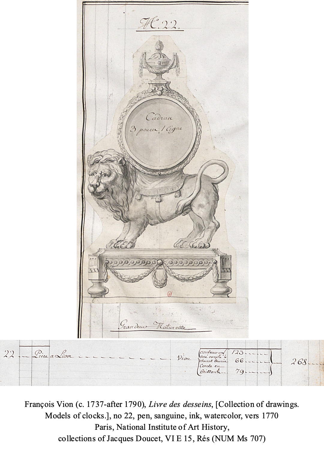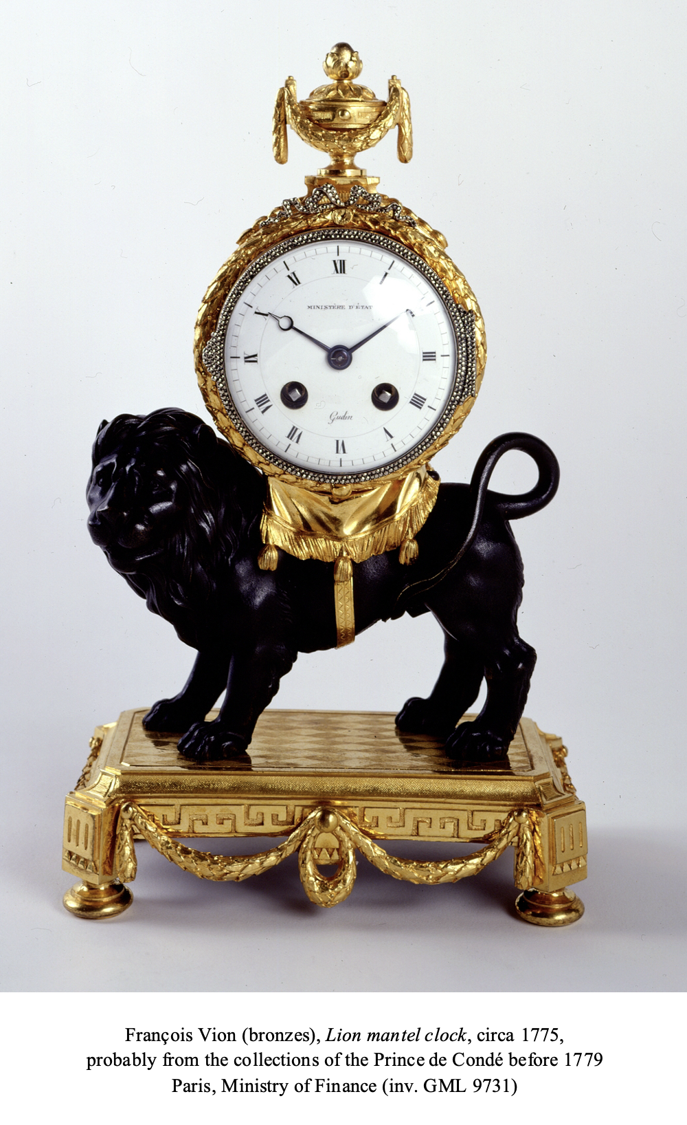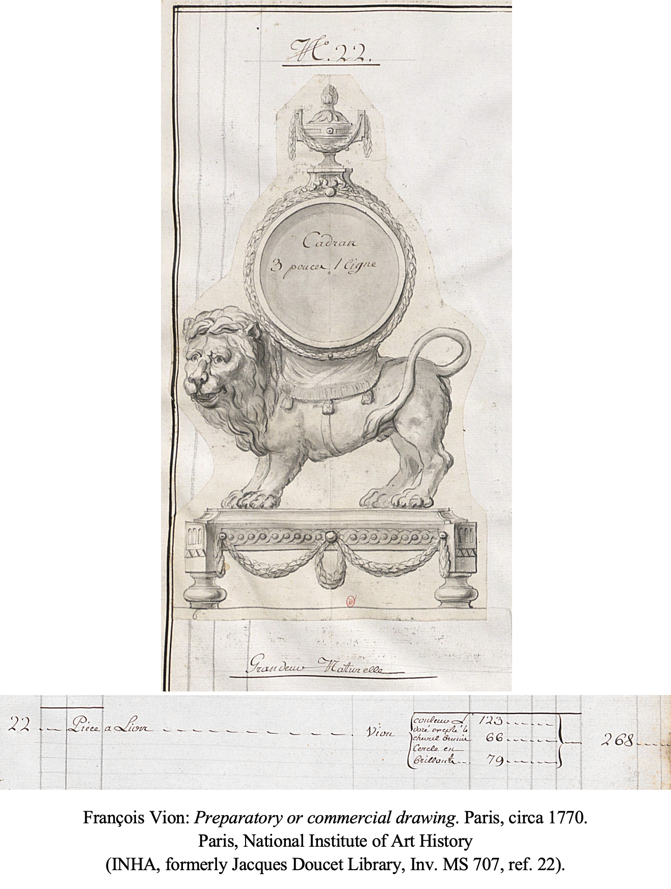 Clocks featuring movements supported by the figures of animals first appeared during the reign of Louis XV and became extremely popular during the second half of the 18th century. At that time the decorative arts in France – and especially in Paris – were changing completely, due to the advent of the neoclassical movement. The present clock stands out due to its unusual design and the quality of its chasing and gilding. A preparatory drawing that was done prior to its production is today in the Institut national d’Histoire de l’Art à Paris (drawing number 22 in the album of bronze caster François Vion). The existence of this drawing allows us to confidently attribute the model to Parisian bronze caster Vion (see H. Ottomeyer and P. Pröschel, Vergoldete Bronzen, Die Bronzearbeiten des Spätbarock und Klassizismus, Munich, 1986, Band I, p. 193, fig. 3.11.6).