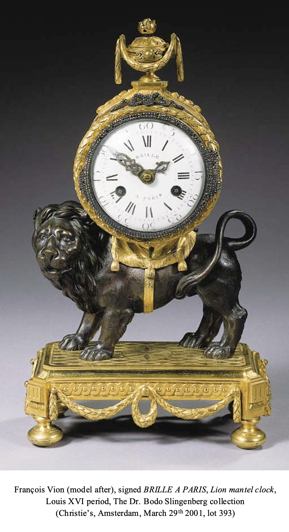 By the 18th century, a small number of examples of this model, sometimes further adorned with marcasites, were mentioned as belonging to important Parisian collectors of the time. One such example is as follows: “…a clock with enamel dial that strikes and marks the hours and minutes, in its colored gilt copper case adorned with marcasites, mounted on the back of a lion on a base or gilt and silvered copper…” that was described in the late 18th century as belonging to a member of the Giambone family. Another example is a “clock made by Gille, in Paris; the case in the form of a drum, carried by a lion: the whole in finely gilt bronze; the bezel surrounding the glass garnished with stones of marcasite, with a small vase at the summit. The 8-day going movement features striking”. That clock was offered at the sale of the property of Duke Charles de Lorraine in May 1781.