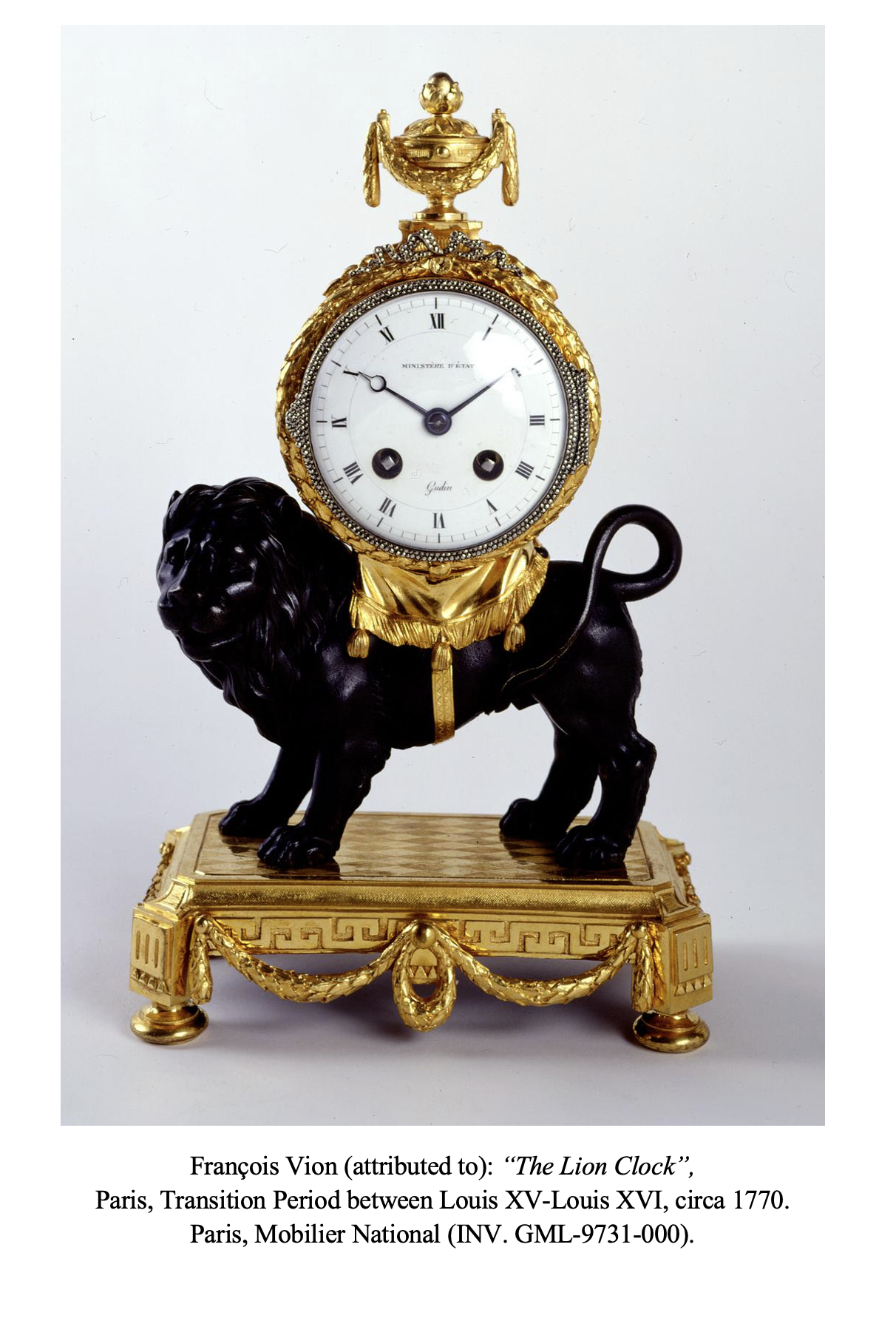 By the 18th century, a small number of examples of this model, sometimes further adorned with marcasites, were mentioned as belonging to important Parisian collectors of the time. One such example is as follows: “…a clock with enamel dial that strikes and marks the hours and minutes, in its colored gilt copper case adorned with marcasites, mounted on the back of a lion on a base or gilt and silvered copper…” that was described in the late 18th century as belonging to a member of the Giambone family. Another example is a “clock made by Gille, in Paris; the case in the form of a drum, carried by a lion: the whole in finely gilt bronze; the bezel surrounding the glass garnished with stones of marcasite, with a small vase at the summit. The 8-day going movement features striking”. That clock was offered at the sale of the property of Duke Charles de Lorraine in May 1781. Lastly, in the late 19th century a “Small clock from the Louis XVI period, in gilt bronze and green patinated bronze, with a movement visible through the glass dial, bearing the name of Lepaute, in Paris. The dial, whose hands and bezel are decorated with marcasites, is set in a drum case surmounted by an urn and supported on the back of a green bronze lion that is looking toward the left. The lion is raised on a rectangular bronze base with projecting corners that are adorned with triglyphs. The base is decorated with Greek keys and laurel garlands in green patinated bronze vert. Height 31cm; width 18cm” was described as being in the collection of the Count d’Armaillé.