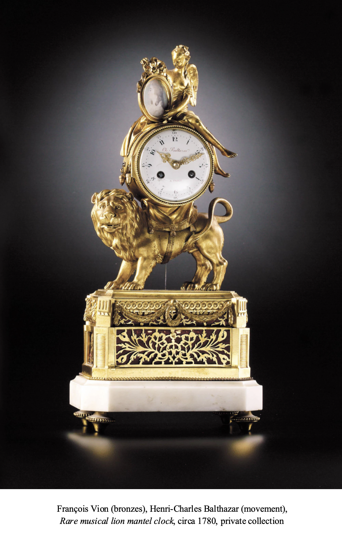 PROVENANCE: Probably previously in the collection of Louis-Hector-Cyr, Marquis de Sailly (1721-1779), valued at 110 livres in his posthumous inventory, which described it as being in the bedroom of his wife, née Letellier de Souvré: “A mantel clock signed by Dautel in Paris, supported by a lion on a gilt copper base”.