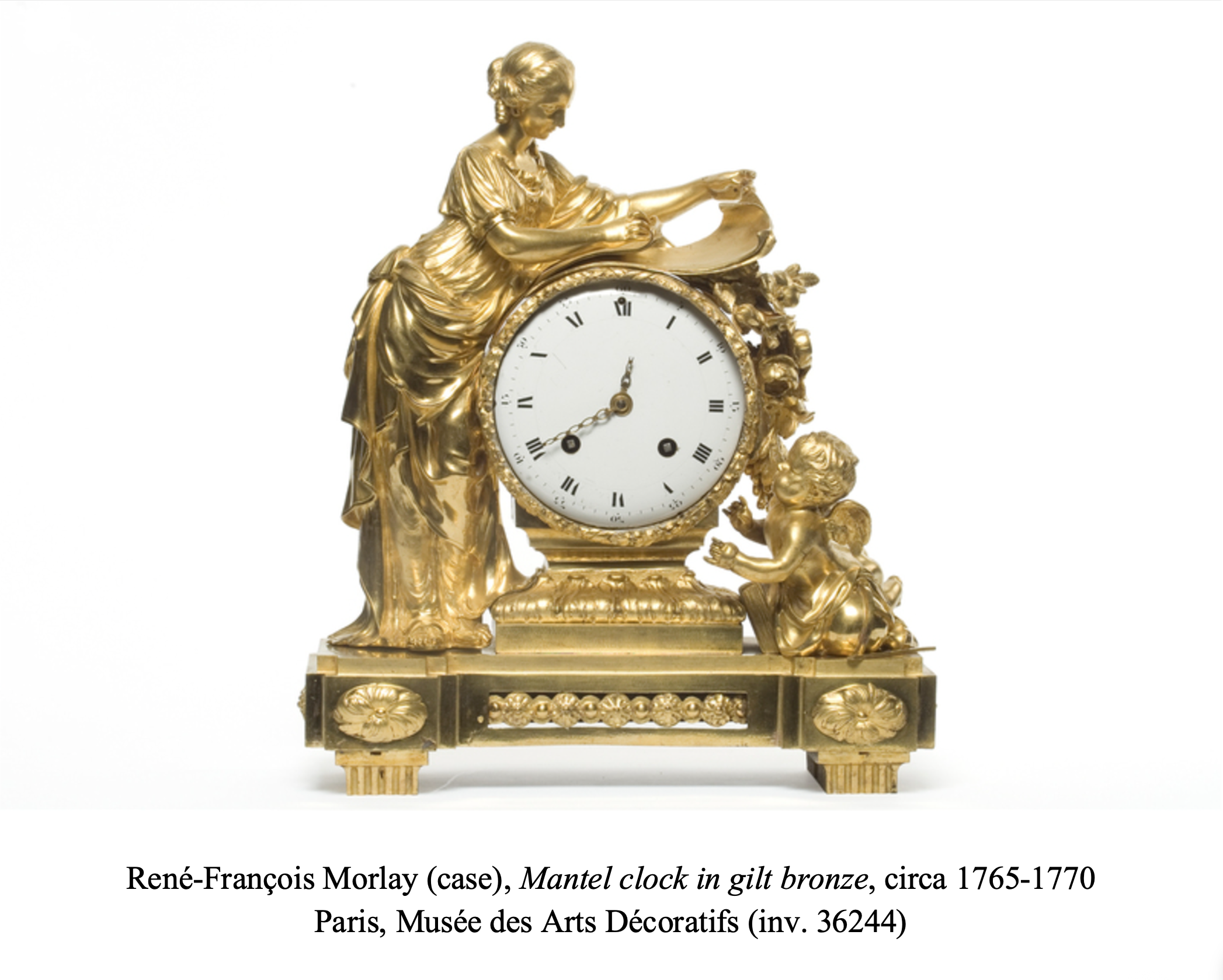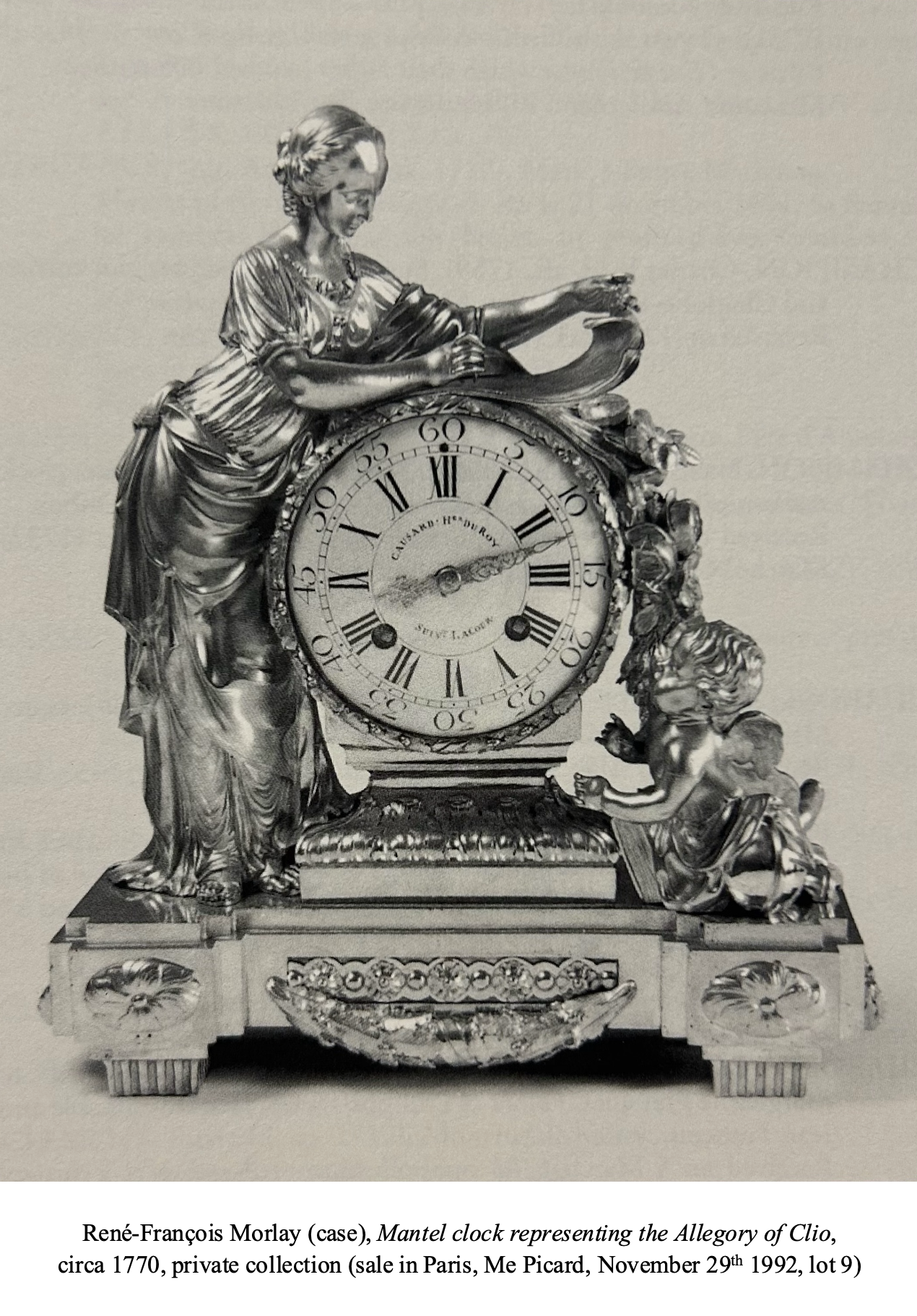 Relatively close to a number of similar models by Parisian bronze casters of the time, such as Robert Osmond and Jean-Joseph de Saint-Germain, the present clock may be attributed to the Parisian bronzier René-François Morlay, the creator of a magnificent carillon clock that was formerly in the collection of the Marquis of Hertford, today in the Wallace Collection in London (see P. Hugues, The Wallace Collection, Catalogue of Furniture, London, 1996, p. 418-425). Morlay made a clock identical to the present one; it bears his signature stamped in the bronze (see J-D. Augarde, Les ouvriers du Temps, Geneva, 1996, p. 293, fig. 223).