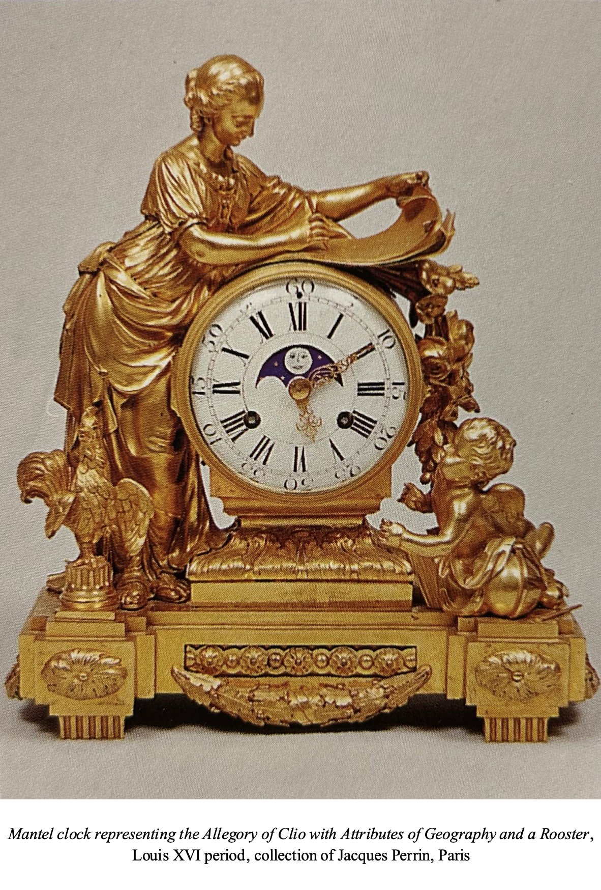 The round white enamel dial, signed “Montjoye à Paris”, indicates the Roman numeral hours and the Arabic five-minute intervals by means of two pierced gilt bronze hands. It is housed in a gilt and patinated bronze case. A fine female figure symbolizing the muse Clio, is dressed in a classical toga and laced sandals, and wears her hair in a bun. She stands to one side, examining a parchment engraved with geometrical motifs. On the other side of the case, there is a garland of leaves and flowers; beside it, a young winged putto observes the Muse. He is standing with a globe, the symbol of knowledge, beside him. The shaped quadrangular base is decorated with motifs including garlands of oak leaves and acorns, rosettes and friezes of alternating cabochon and stylized flower motifs within sunken reserves. The clock is raised upon four fluted straight quadrangular feet.