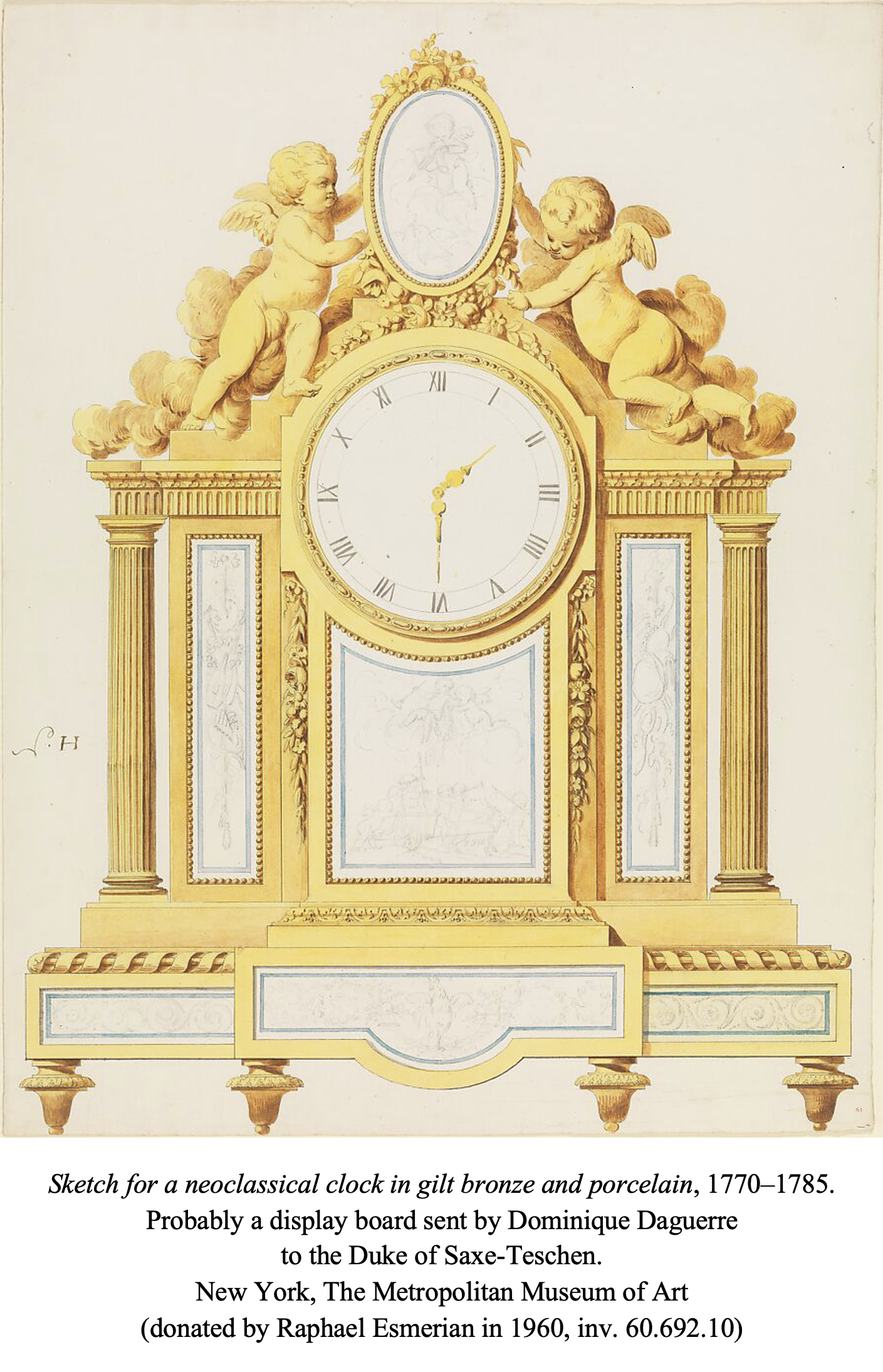 It is likely that the present clock has an equally prestigious provenance. Its remarkable design is the same as that seen in an anonymous drawing from the Esmerian collection, which is today in the Metropolitan Museum of Art (see R. Baarsen, Paris 1650-1900 Decorative Arts in the Rijksmuseum, New Haven, 2013, p. 428, fig. 103). This drawing, probably not a preparatory sketch made prior to the clock’s creation, was most likely executed for Daguerre, who would have sent it to the Duke of Saxe-Teschen to present the items for sale in his Paris store. This hypothesis is confirmed by the existence of several drawings representing bronze-mounted porcelain vases, which, according to F.J.B. Watson, would have been part of an album or catalogue of objects sent by Daguerre to the Duke of Saxe-Teschen and his wife. The album also contains a remarkable celadon porcelain vase with gilt bronze mounts, which was in the Qizilbash collection (Sold at Christie’s, Paris, December 19, 2007, lot 803). It is interesting to note that at the time the Duke and Duchess of Saxe-Teschen were building Laeken Palace near Brussels. They wanted to furnish Laeken, built in the classical style by architect Charles de Wailly, in the latest Parisian style. A contemporary who visited the palace in 1786 was impressed by its extraordinary opulence: “There was an infinite number of excellent bronzes, as well as clocks of all types, elegant and splendid armchairs, firedogs… It is the most luxurious and the best furnished palace in the region”. There can be no doubt that the enthusiastic description of the 18th century connoisseur who was completely enchanted with the remarkable furnishings at Laeken corresponds perfectly to the present clock’s remarkable elegance and charm.