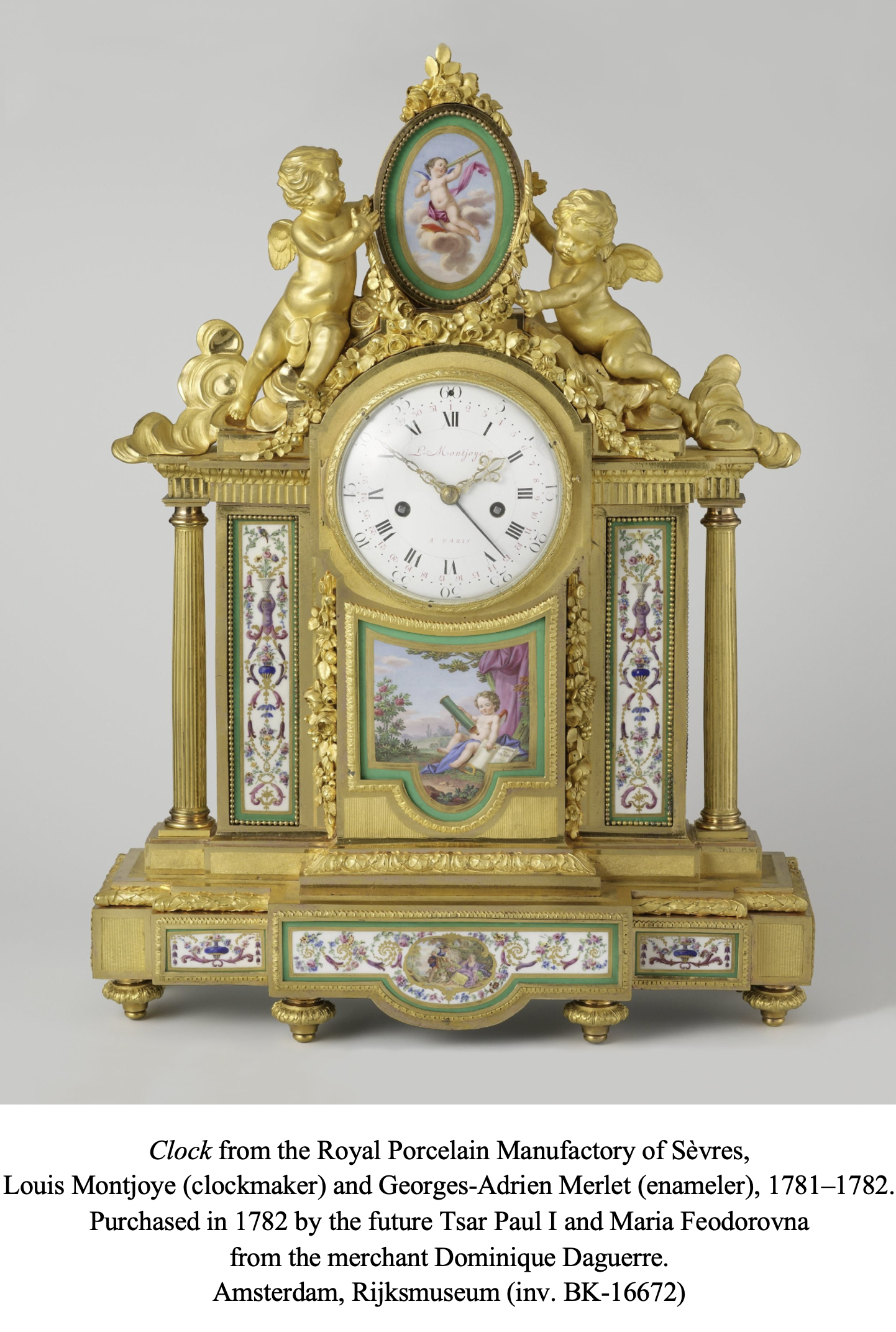 The second, signed by clockmaker Louis Montjoye and dated 1782, is on display at the Rijksmuseum in Amsterdam (illustrated in P. Verlet, Les bronzes dorés français du XVIIIe siècle, Paris, 1999, p. 37, fig. 28). Sold by the Soviet government in 1932, it had been purchased in Paris in 1782, to the marchand mercier Dominique Daguerre, by Grand Duke Paul of Russia (1754-1801), the future Czar Paul I, and his wife Maria Feodorovna, who were then travelling in Europe under the names of the Count and Countess du Nord. An early 20th century photograph shows the clock on the mantelpiece of Maria Feodorovna’s bedchamber in the Pavlovsk Palace (see A. Darr, The Dodge Collection: Eighteenth-Century French and English Art in the Detroit Institute of Arts, 1996, p. 17).