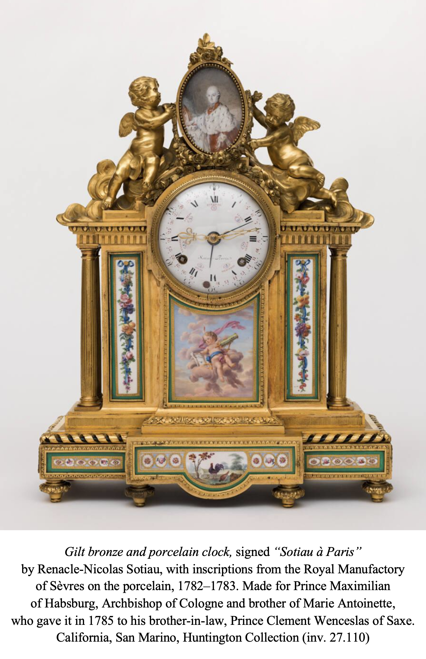 He was no doubt the principal and most talented representative of Parisian luxury horology during the decade preceding the French Revolution. After becoming a master on June 24, 1782, he opened a workshop in the rue Saint-Honoré; it became a great success with the important collectors of the period. The important Parisian marchands-merciers, especially François Darnault and Dominique Daguerre, commissioned him to produce clock movements for eminent and exacting collectors, which were masterpieces of elegance and perfection. Like all the finest clockmakers, Sotiau acquired his clock cases from the best and most skilful artisans, often working with the bronze casters Pierre-Philippe Thomire and François Rémond. The excellence of his work won him the coveted title of “Horloger de Monseigneur le Dauphin” (the dauphin being the elder son of Louis XVI and Marie-Antoinette). His clocks are often mentioned in probate inventories and appeared in the sales of the collections of important contemporary personalities. Clocks made by Sotiau were owned by financiers such as the wealthy Court banker Jean-Joseph de Laborde, important members of the Clergy, such as François-Camille, Prince de Lorraine, and influential aristocrats such as Louis-Antoine-Auguste de Rohan-Chabot, Duc de Chabot; Charles-Just de Beauvau, Prince de Craon; and Albert-Paul de Mesmes, comte d’Avaux. In addition to his private clientele, Sotiau also produced magnificent clocks for the Prince Regent of England (the future King George IV), as well as for Mesdames de France (the aunts of Louis XVI), and for Queen Marie-Antoinette. Today Sotiau’s clocks may be found in the most important international collections, both public and private. Among these are the Walters Art Gallery in Baltimore, the Frick Collection in New York, the Huntington collection in San Marino and the Musée national du Château de Versailles, as well as the Royal British and Spanish Collections.