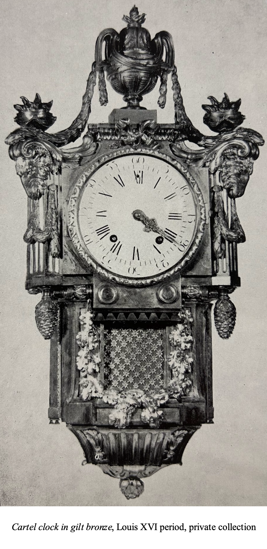 By the mid 18th century, the ornamental vocabulary that had prevailed for several decades was being called into question. This movement, led by scholars, artists and connoisseurs, had been instigated by the extraordinary archeological discoveries that had taken place in the ancient Roman cities of Pompeii and Herculaneum, near Naples. Over the years, a handful of collectors, artists, and artisans succeeded in imposing a new style, known as neoclassicism, which was directly inspired by Greek and Roman antiquity. The present cartel was created within this particular context. Its highly architectural design and unusual size are remarkable, as is its decorative vocabulary directly influenced by the classical idiom. While the identity of the bronze caster who created it is not known, the exceptional quality of the casting, chasing, and gilding prove that it was made by very fine artisans, under the supervision of a superb bronzier such as Saint-Germain, Osmond or Caffieri. Among the similar cartels known to exist, one example signed “Gide à Paris” is illustrated in R. Mühe and Horand M. Vogel, Horloges anciennes, Manuel des horloges de table, des horloges murales et des pendules de parquet européennes, Office du Livre, Fribourg, 1978, p. 190, fig. 350. A few other identical cartels have been identified. One of these was offered at auction at the Palais Galliera in Paris by Me Ader on March 30, 1965, lot 75 (see Tardy, La pendule française, 2èe Partie: Du Louis XVI à nos jours, Paris, 1975, p. 310, fig. 2). A second clock was formerly in the well-known collection of Alberto Bruni Tedeschi (1915-1996).