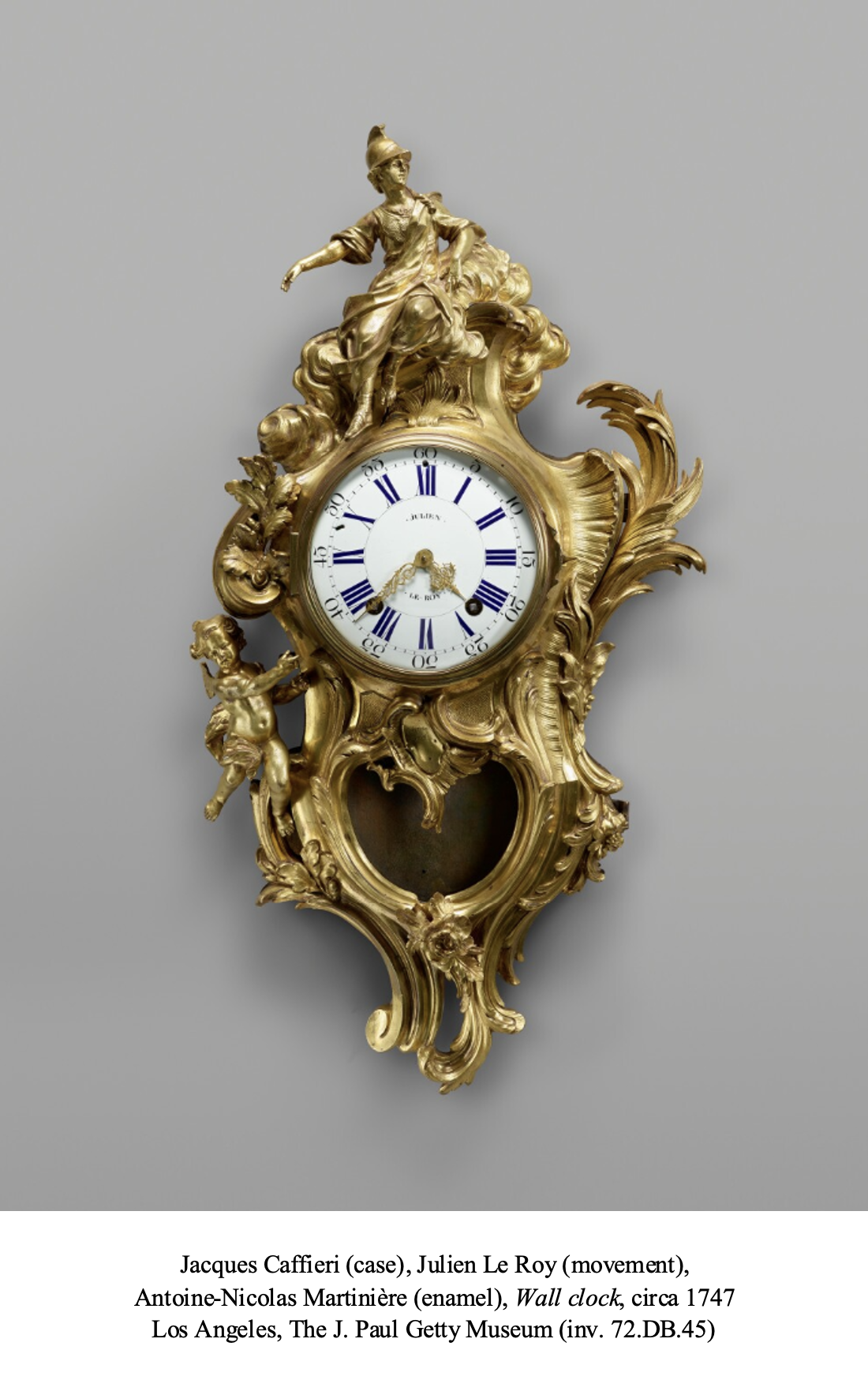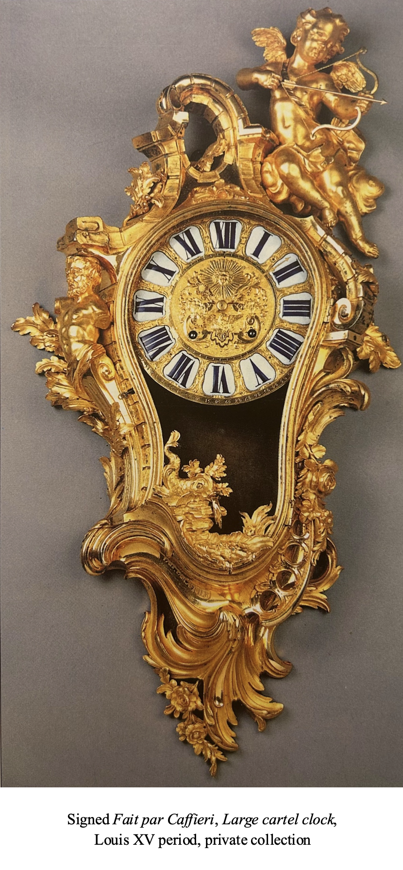 This superb clock with a rare and possibly unique case bears witness to the fruitful collaboration between 18th century Parisian clock and case makers. The case is comparable in style and quality to other models created by Jacques Caffieri (1678-1755) who often supplied cases to Julien Le Roy (1686-1759). Among them, a similar cartel, dated 1747, is decorated with the figures of Minerva and Cupid; it is now in the J. Paul Getty Museum in California. The present cartel dates from the same period, since it is stamped with a C-couronné poinçon (proof of a tax payment imposed between March 1745 and February 1749). Another similar case by Caffieri surmounted by a Cupid was formerly in the Keck Collection at La Lanterne Bel Air (sold in New York December 1991); another, also surmounted by a putto, was sold in Paris in June 1991.