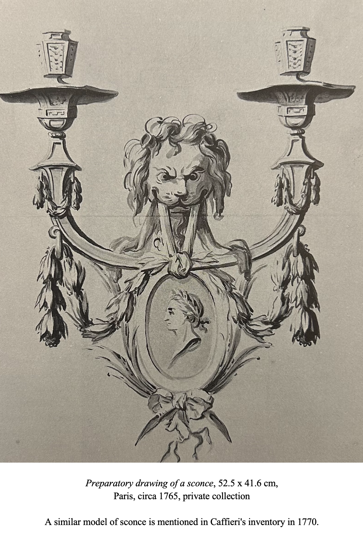 That comparison is supported by the inventory of the bronze caster’s stock, drawn up after his wife’s death in December 1770. It lists wall lights comparable to the present pair, such as “a model with two arms in the antique style, with a lion’s head and a lion’s skin suspended from the branches” valued at 160 livres, and “…another sconce with three arms, a garland of oak leaves on each branch and a ribbon-tied bow on the plate, and three others with one branch and with mascarons on the plates… » valued at 51 livres.