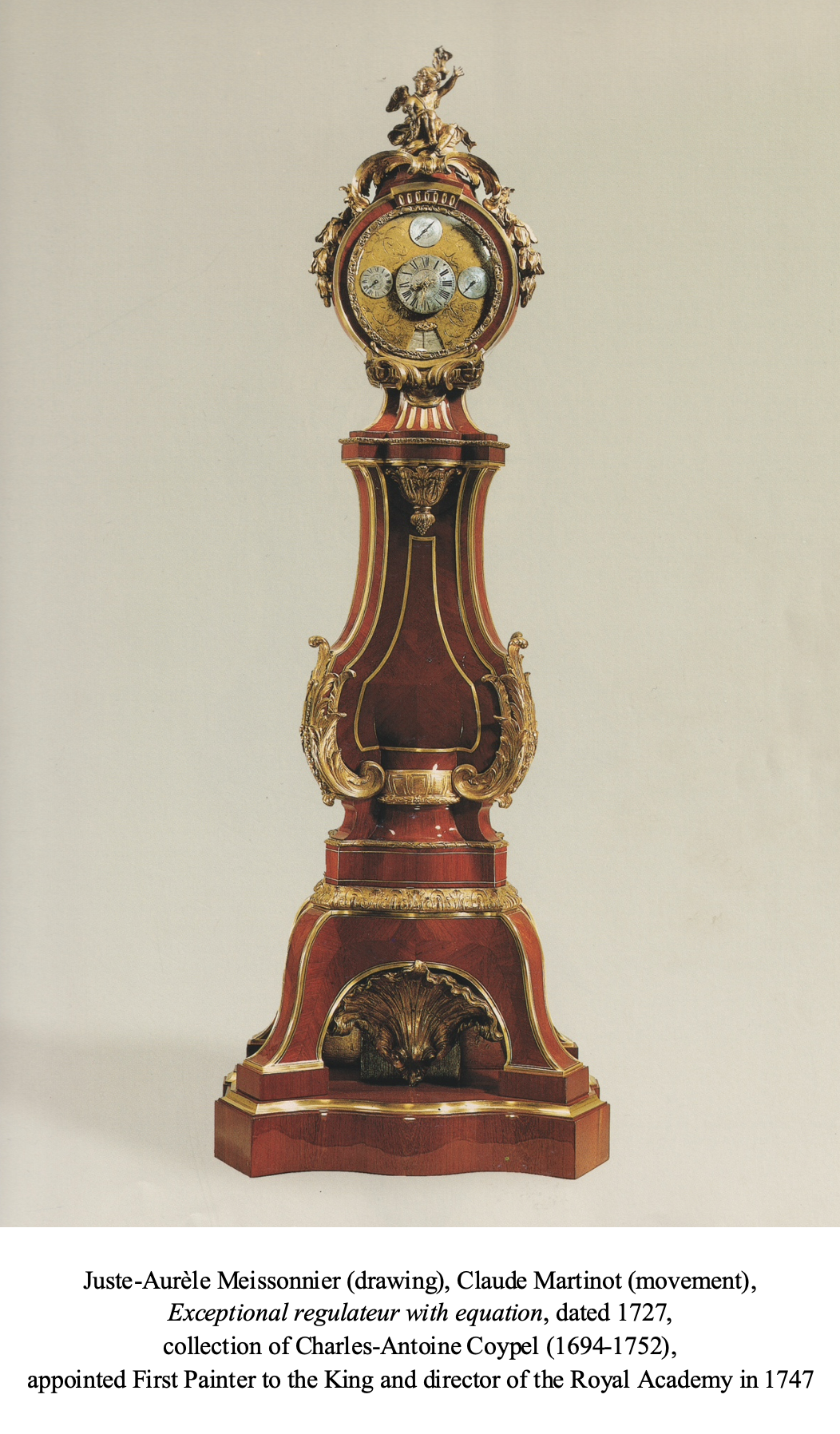 The spectacular and particularly successful design of this extraordinary regulator, or “pendule à secondes”, was inspired by the work of early 18th century designers, and particularly those of the renowned designer, sculptor, and goldsmith Juste-Aurèle Meissonnier (1695-1750), whom his peers considered the leader of the Rococo movement (see P. Fuhring, Juste-Aurèle Meissonnier: Un génie du rococo 1695-1750, Turin, 1999). Meissonnier, a brilliant and prolific artist, exercised a powerful influence on the French and European decorative arts for a period of several decades. He greatly contributed to the popularity of the rococo, until the neoclassical style became dominant. The present example also has a rare feature: a movement with complications including one of the earliest indications of the equation du temps, or the difference between true time and mean time.
