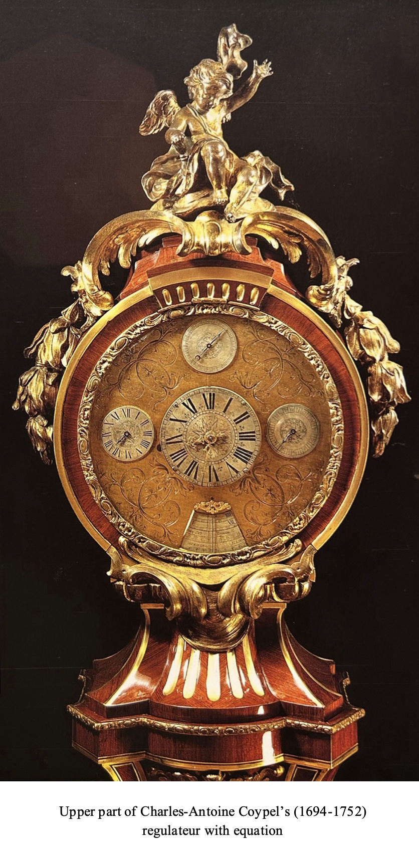 The same complication appears in a regulator similar to the present example, which belonged to the artist Charles-Antoine Coypel during the 18th century; in the sale held after the death of the painter in 1753 it was described as follows: “579. 1 clock with seconds, which in addition to the hours, marks true time and mean time, the course of the sun, the date, and the day of the week; the movements are by M. Claude Martinot, and the case is by M. Meissonnier”.