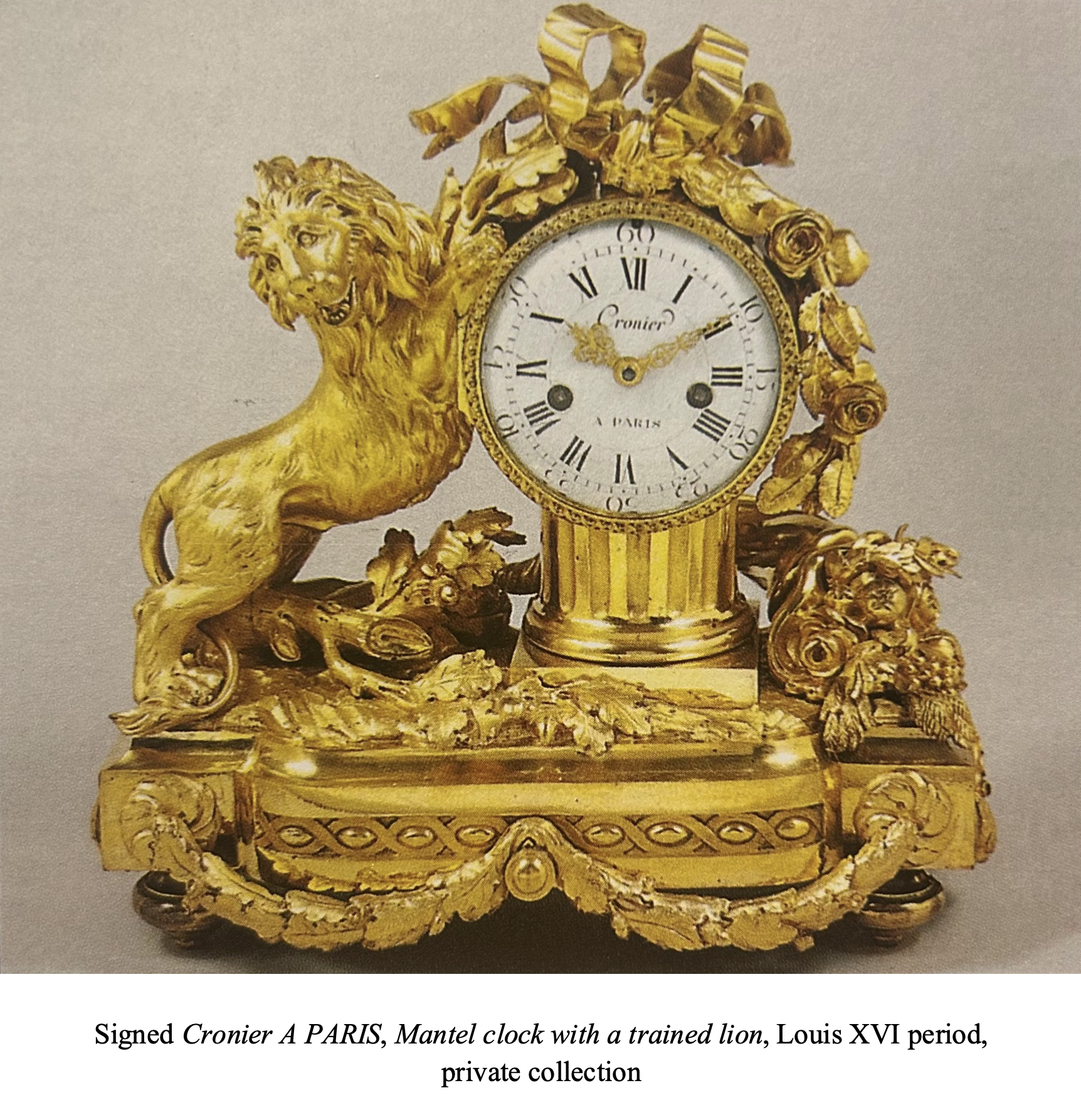 A second clock, whose dial was signed “Cronier”, is illustrated in P. Kjellberg, Encyclopédie de la pendule française du Moyen Age au XXe siècle, Les éditions de l’Amateur, Paris, 1997, p. 280, fig. A.