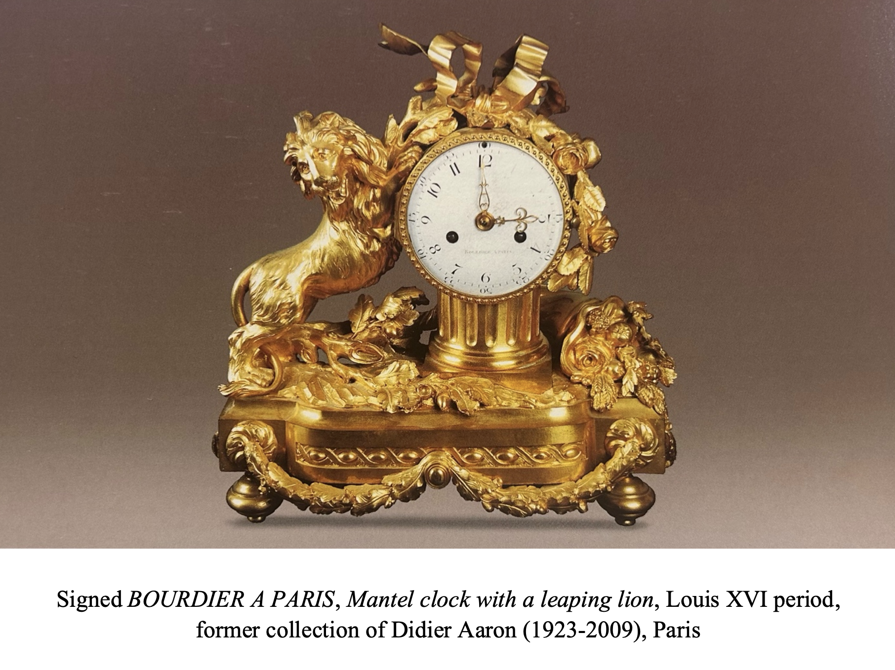 The present rare mantel clock was created in the late 1760s or early 1770s by a Parisian bronze caster whose identity is currently not known, for the cabinetmaker Antoine Foullet, who, due to the strict regulations of the artisans’ guilds of the period, could not create bronze pieces, but could nevertheless sell them and enjoy exclusive commercial rights to these pieces. Only a few examples of the model were made. Among them, one example, whose dial was signed “Bourdier”, was formerly offered by the Galerie Didier Aaron (illustrated in J-D. Augarde, Les ouvriers du Temps, La pendule à Paris de Louis XIV à Napoléon Ier, Editions Antiquorum, Genève, 1996, p. 284, fig. 216, and in H. Ottomeyer and P. Pröschel, Vergoldete Bronzen, Die Bronzearbeiten des Spätbarock und Klassizismus, Band I, Munich, 1986, p. 193, fig. 3.11.5).