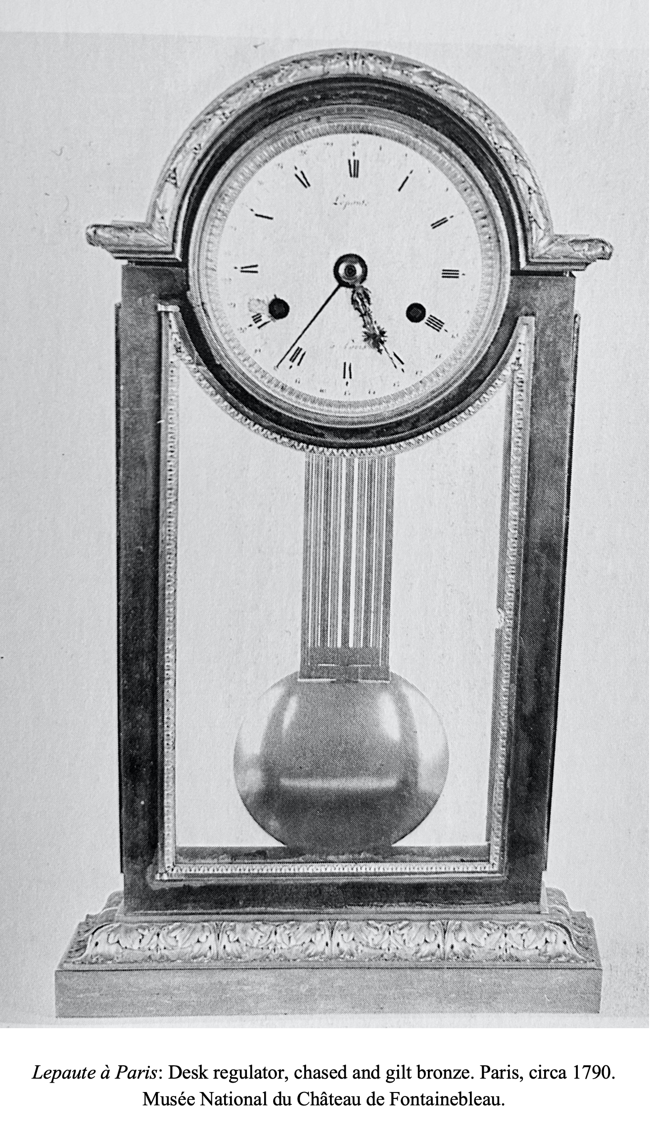 The elegant and sober design of the present rare desk regulator emphasizes the clock’s complex and precise mechanism, as well as the exceptionally fine chasing and gilding of its architectural case. While the bronze caster and chaser who executed the case during the final years of the reign of Louis XVI has not yet been identified, it was no doubt sold by the Lepaute workshop, for almost all known similar examples bear the Lepaute signature. The signature on the present clock, “Lepaute à Paris”, probably refers to Pierre-Basile Lepaute, known as Sully-Lepaute (1750-1843). Among the identical clocks known, one regulator is illustrated in P. Kjellberg, Encyclopédie de la pendule française du Moyen Age à nos jours, Les éditions de l’Amateur, Paris, 1997, p. 183. A second example, which was mentioned in the early 19th century as being in the Saint-Cloud Palace, is now part of the Mobilier national (illustrated in M-F. Dupuy-Baylet, De bronze et de cristal, objets d’ameublement XVIIIe-XIXe siècles du Mobilier national, Editions Faton, Dijon, 2020, p. 52-53, catalogue n° 11). Lepaute delivered a third example in 1804, intended for the pope’s bedchamber in the Château of Fontainebleau: a contemporary commentary stated, “The Execution of both the case and the movement of this clock are as close as possible to perfection…” (see J-P. Samoyault, Musée national du Château de Fontainebleau, Catalogue des collections de mobilier, 1. Pendules et bronzes d’ameublement entrés sous le Premier Empire, RMN, Paris, 1989, p. 67, catalogue n° 28).