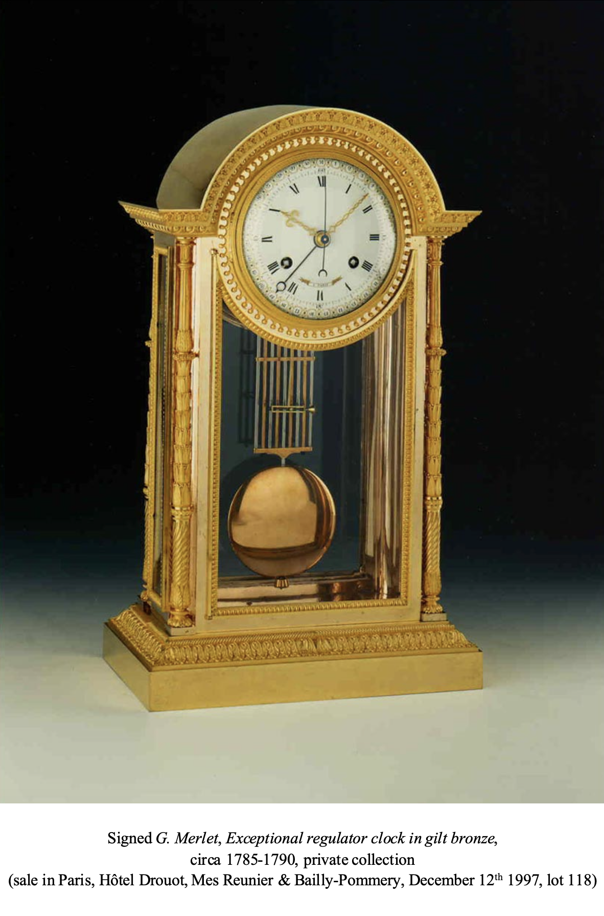 The round white enamel dial is signed “Revel” by the clockmaker Joseph-Marie Revel and also bears the mark “G Merlet” for Georges-Adrien Merlet, one of the finest Parisian enamellers of the time, and Joseph Coteau’s main rival. It indicates, by means of three hands, the Roman numeral hours, the Arabic numeral five-minute intervals, and the date in 30 days, along its outermost edge, shown within hexagonal cartouches with small green cabochons and gilt flowers alternating with coral-colored dots; a central hand indicates the seconds. The movement supports the bimetallic compensation pendulum with a bob. The magnificent gilt bronze neoclassic case is finely chased and gilt with matte and burnished finishing; the clock is glazed on all four sides, and its framework is adorned with waterleaf motifs. The knurled bezel is adorned with a large bead frieze; the rounded pediment is decorated with waterleaf and stem friezes with seeds and egg-and-dart motifs; the shaped corners are embellished with columns, beaded knops, leaf bouquets, palm leaves, piasters and spiral fluting, which rest on molded pedestals. The clock stands on a quadrangular base adorned with a waterleaf and cord frieze.