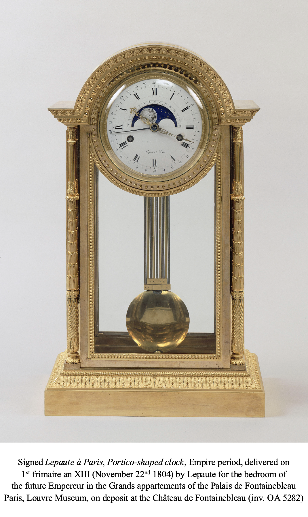 ; the third clock, whose dial is signed “Lepaute”, was in Napoleon’s study in 1804 at Fontainebleau Palace (see J-P. Samoyault, Musée national du Château de Fontainebleau, Catalogue des collections de mobilier, 1-Pendules et bronzes d’ameublement entrés sous le Premier Empire, RMN, Paris, 1989, p. 66, catalogue n° 27).