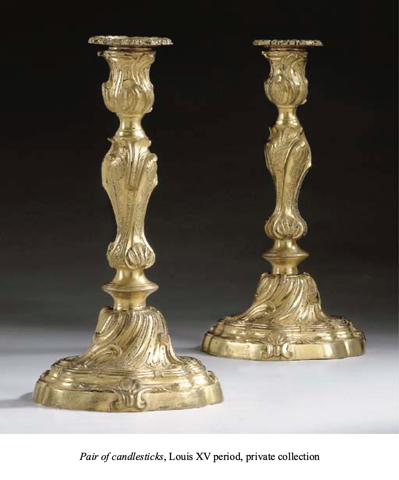 The present pair of candlesticks was thus created in that particular context. Their design, nevertheless, presents a sober manner, with precisely chased motifs and a more balanced general composition, suggesting they are posterior to Meissonnier’s design, perhaps by several decades. Today, only a small number of similar models are known. Among them are rococo candlesticks that may be dated to the 1730s, including one example that is in the Louvre Museum in Paris (illustrated in G. Mabille, Le style Louis XV, Editions Baschet et Cie, Paris, 1978, p. 173, fig. 7). A second example, formerly in the David-Weill collection, is illustrated in G. Henriot, Le luminaire de la Renaissance au XIXe siècle, Paris, 1933, plate 161, n° 5. Several models from the mid-18th century are comparable to the present candlestick: one example is illustrated in Collection Connaissance des Arts, Le Dix-Huitième Siècle français, Hachette, 1956, p. 129; a second one, bearing the crowned C-stamp (1745-1749) was in the Château de Versailles during the 19th century; it is now in the Louvre Museum in Paris (see D. Alcouffe, A. Dion-Tenenbaum and G. Mabille, Les bronzes d’ameublement du Louvre, Editions Faton, Dijon, 2004, p. 58, catalogue n° 22).