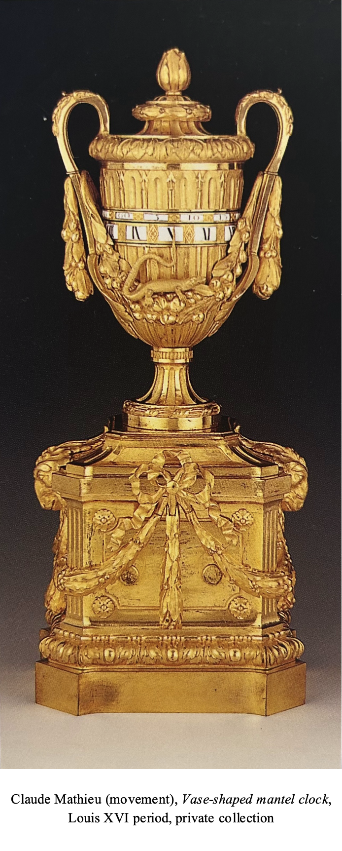 The signature “Mathieu fecit” is that of Claude Mathieu, known as “Mathieu the elder”, one of the most important Parisian clockmakers of the second half of the 18th century. The brother of clockmaker Edme Mathieu, known as “Mathieu the younger”, he became a master on July 31, 1754. His workshop is recorded in the rue Neuve des Capucins in 1754 and the rue Saint-Honoré as of 1757 (see J-D. Augarde, Les ouvriers du Temps, Genève, 1996, p. 374). He quickly gained renown among knowledgeable collectors of luxury horology, especially the Count de La Marck; several of his clocks were mentioned as having belonged to important collectors. During the Revolution, he sat on the jury entrusted with resolving questions regarding the new Revolutionary time system.