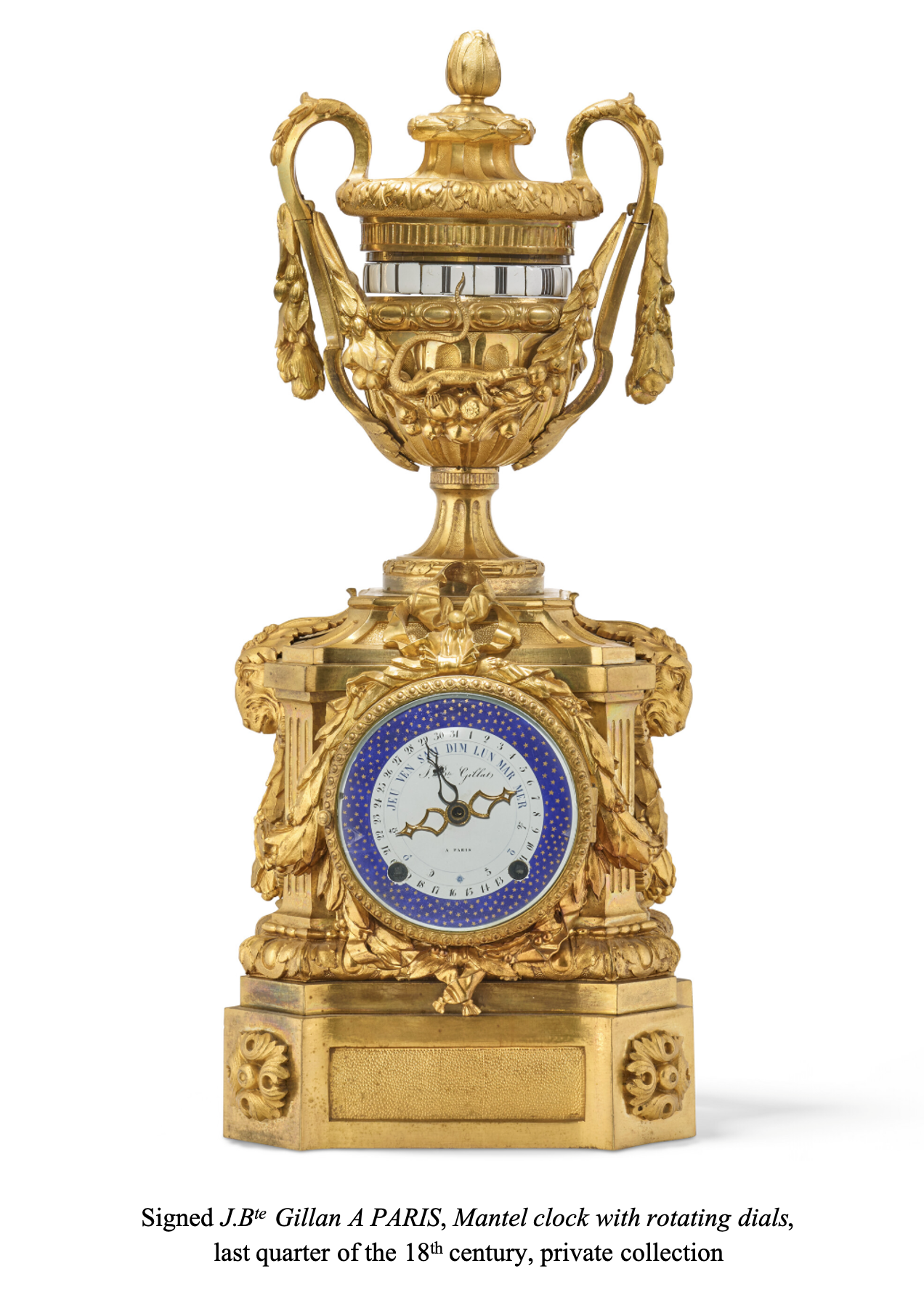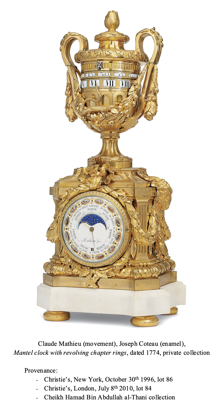 The clock, with cercles tournants (or turning circles) dials, indicates the Roman numeral hours and Arabic numeral five-minute intervals on rectangular enamel cartouches. The movement is housed in an oval vase-form case resting on an architectural base, made of finely chased bronze with matte and burnished gilt finishing. The vase, which terminates in a seed finial, features applied handles from which are suspended a massive flower and fruit swag with a salamander whose tail indicates the time, while small rhinestone-set stars show the hours and the minutes. The flaring foot, decorated with gadrooning and a reed and leaf torus, stands on a molded base with matted reserves, which itself is supported on an architectural base with canted corners. The latter is adorned with ram’s heads on its sides, fluted pilasters in the corners and heavy swags of ribbon-tied laurel leaves. The one on the back features a ribbon from which is suspended a medallion bearing the profile of King Henri IV, while the one on the façade frames a round enamel dial that is signed “Mathieu Fecit” in the middle and “coteau” at the bottom. The counter-enamel is signed “Coteau” and bears the date “1775”. The dial bears the signs of the zodiac along its outer edge, alternating with flower and emerald leaf motifs: it indicates the annual calendar, the days of the week, the date and the age and phases of the moon. The plinth, with canted corners, stands on a white Carrara marble base that is raised on four flattened ball feet.