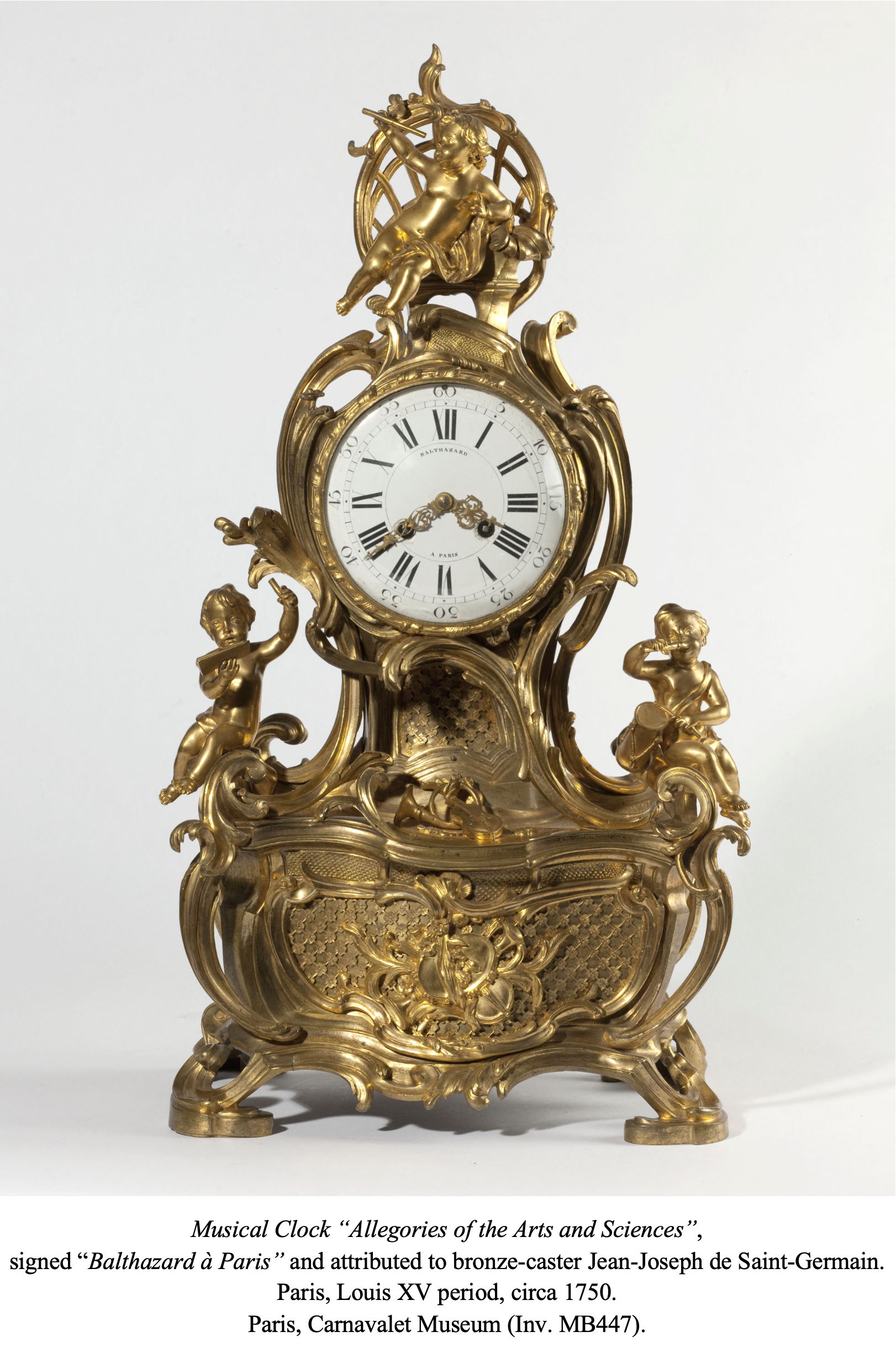 Le dessin particulièrement élaboré de cette pendule nous permet de la faire figurer parmi les modèles d’horloges rocailles les plus aboutis du règne de Louis XV. Sa composition fut créée vers le milieu du XVIIIe siècle par le célèbre bronzier parisien Jean-Joseph de Saint-Germain (1719-1791), puis décliné, avec certaines variantes, dans son atelier pendant près d’une décennie. De nos jours, parmi les quelques rares autres pendules répertoriées de ce type, mentionnons particulièrement : un premier exemplaire, signé Gille l’aîné, qui se trouvait anciennement dans la célèbre collection Alexander dispersée aux enchères en 1999 (voir H. Ottomeyer et P. Pröschel, Vergoldete Bronzen, Band I, Munich, 1986, p.126) ; un deuxième, le cadran de Léchopié, a fait partie des collections Arnold Seligman (vente à Paris, Galerie Charpentier, les 4-5 juin 1935, lot 127) ; deux modèles, l’un signé Balthazar, l’autre Jacques Panier, sont illustrés dans Tardy, La pendule française, 1er Partie : De l’horloge gothique à la pendule Louis XV, Paris, 1967, p.165 ; enfin, citons une dernière pendule de ce type, signée « Balthazard à Paris », qui est exposée dans le Salon Louis XV du Musée Carnavalet à Paris (Inv. MB447, et reproduite dans A. Forray-Carlier, Le mobilier du musée Carnavalet, Dijon, Editions Faton, 2000, p.12).